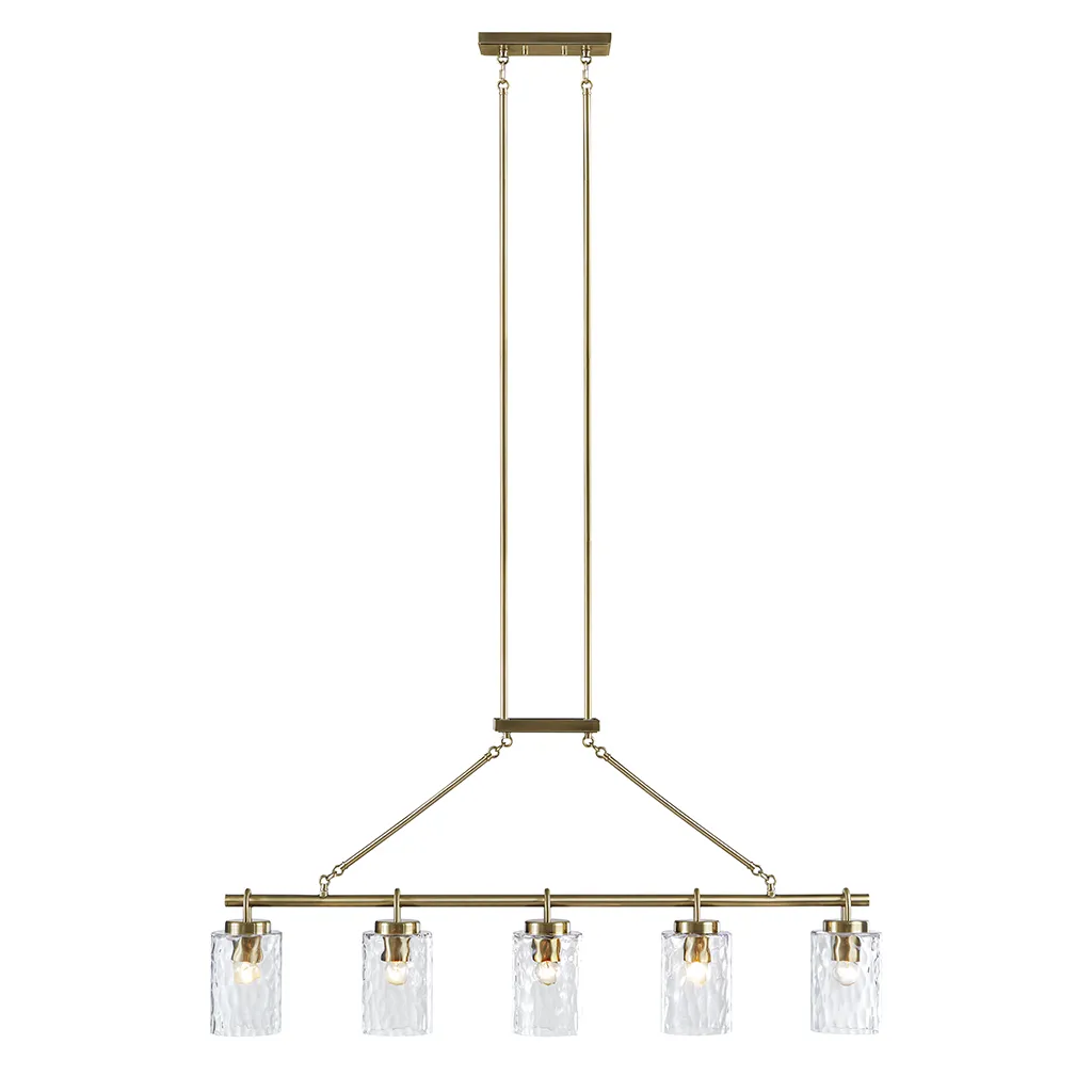 Elevate your space with the Ink+Ivy Curiana 5-light linear chandelier. This stylish fixture blends transitional design with a modern touch, featuring a sleek antique brass finish and five textured glass cylindrical shades. Perfect for entryways, dining rooms, or above kitchen islands, the adjustable rod allows for customized hanging heights. Easy installation with included mounting hardware. Requires five type A bulbs (not included) to bring a touch of luxury to your home.