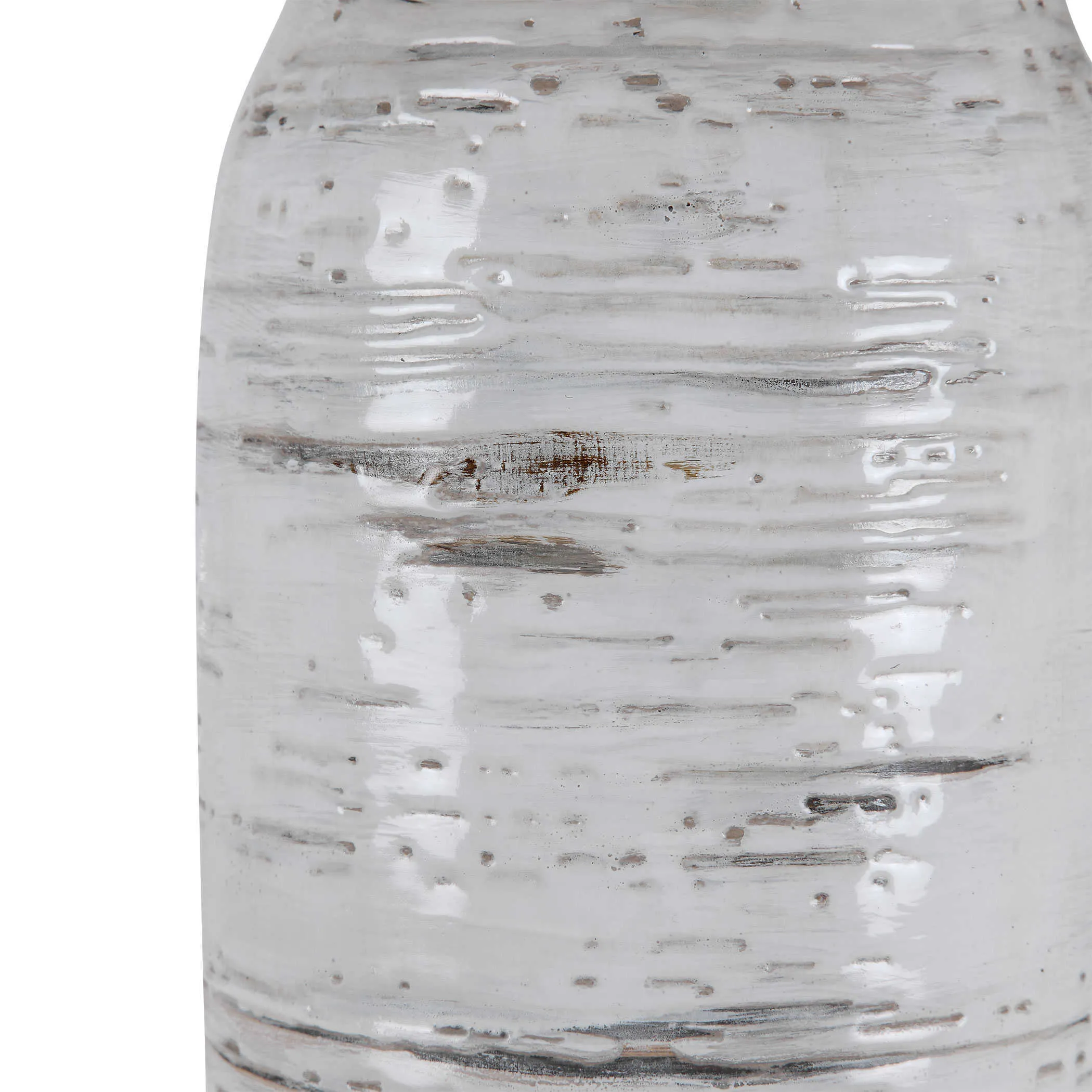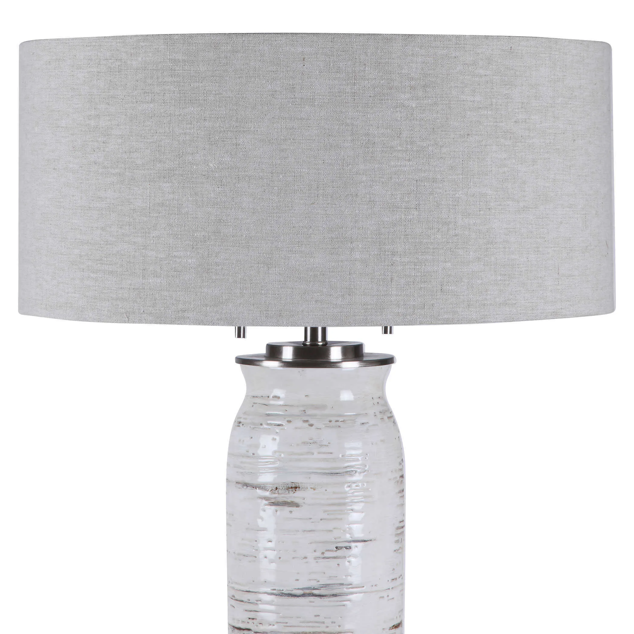 Inspired by the bark of a birch tree, this table lamp features a ceramic base finished in off-white with rust colored accents and noticeable texture and distressing. The piece also has a crystal foot and brushed nickel details. The round hardback shade is a light oatmeal linen fabric with slubbing.