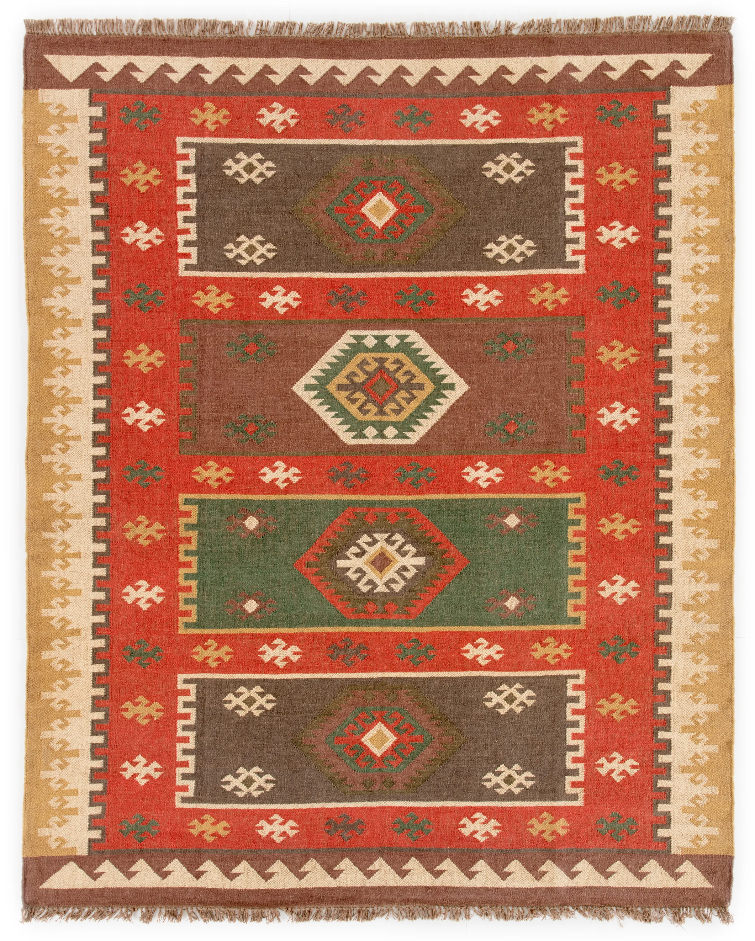 Rich tones and a captivating geometric design combine to create this Southwestern-style area rug. This flatweave jute layer showcases red, gold, navy, and green hues, accented by textured fringe along the edges for an eclectic and subtly rustic look.