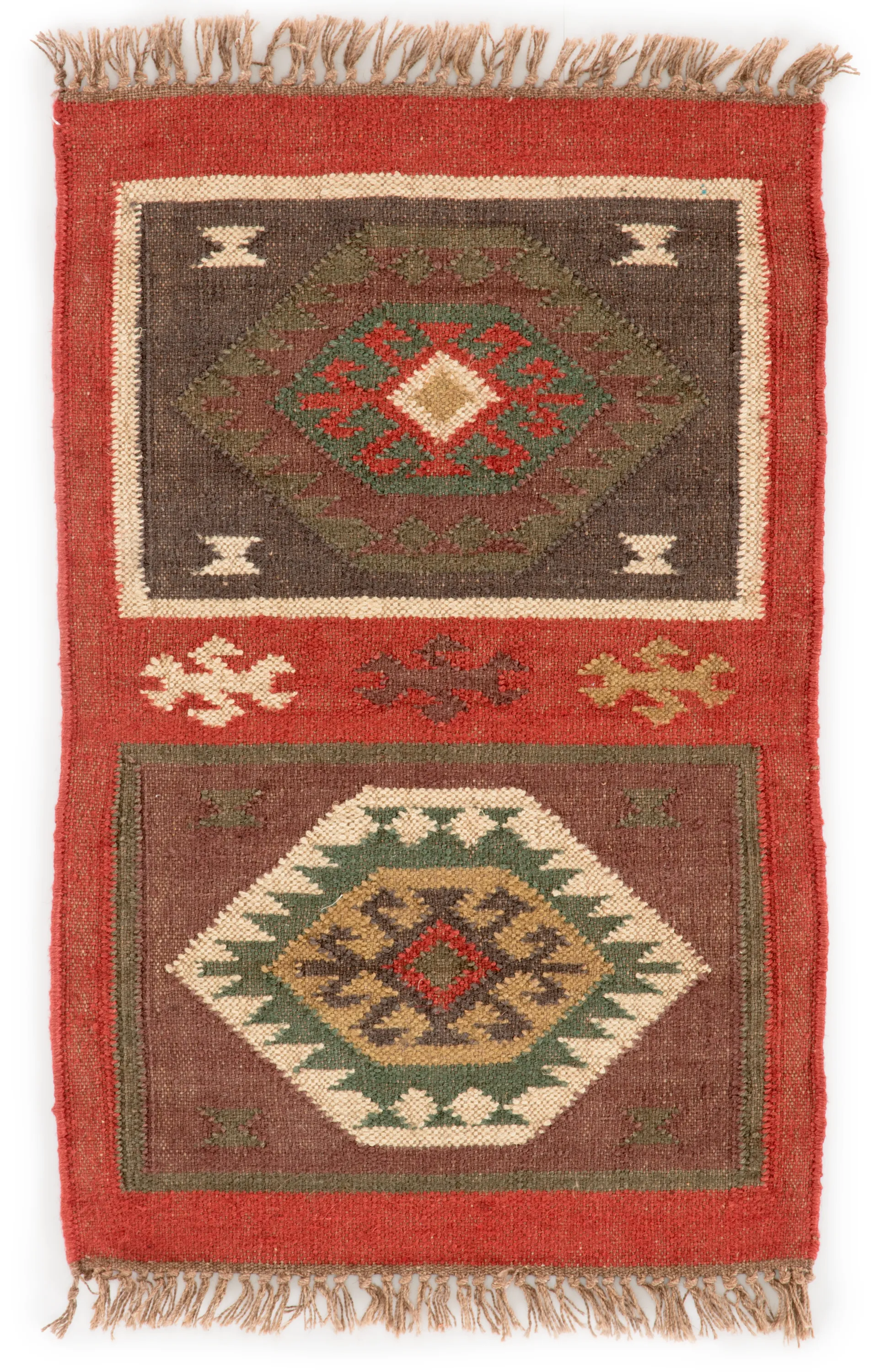 Rich tones and a captivating geometric design combine to create this Southwestern-style area rug. This flatweave jute layer showcases red, gold, navy, and green hues, accented by textured fringe along the edges for an eclectic and subtly rustic look.