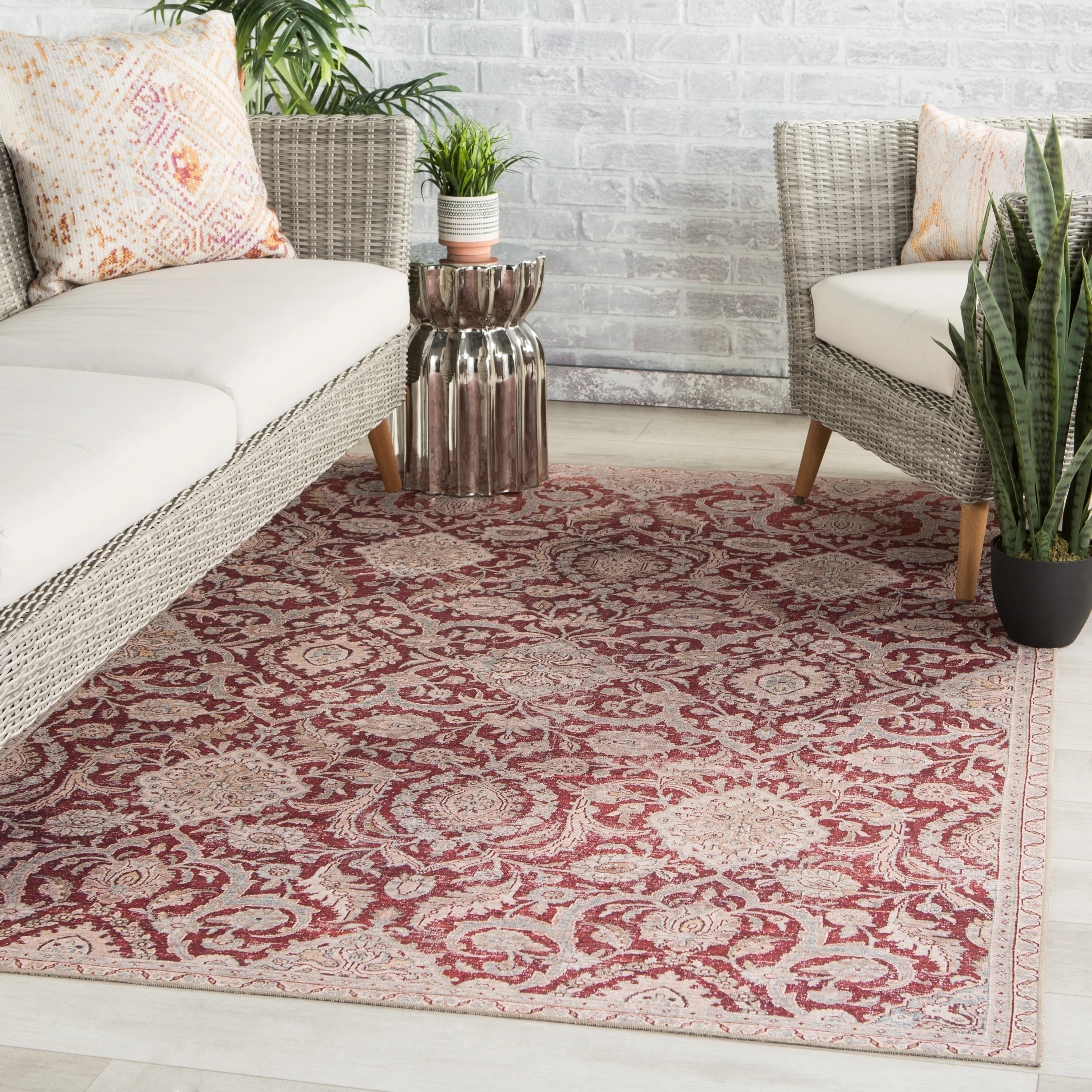 A unique combination of antique rug designs and the durability of an indoor/outdoor construction, the Chateau collection offers vintage vibes to any space. The traditional Sire rug boasts an intricate Turkish pattern of elegant fleurettes in a deep red, beige, pink, and gray colorway. This zero-pile rug is made of weather-resistant polyester for a flat, durable finish.