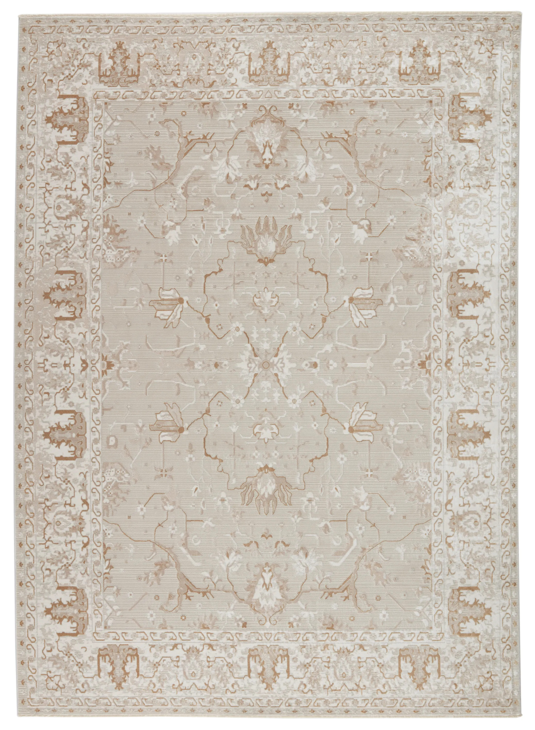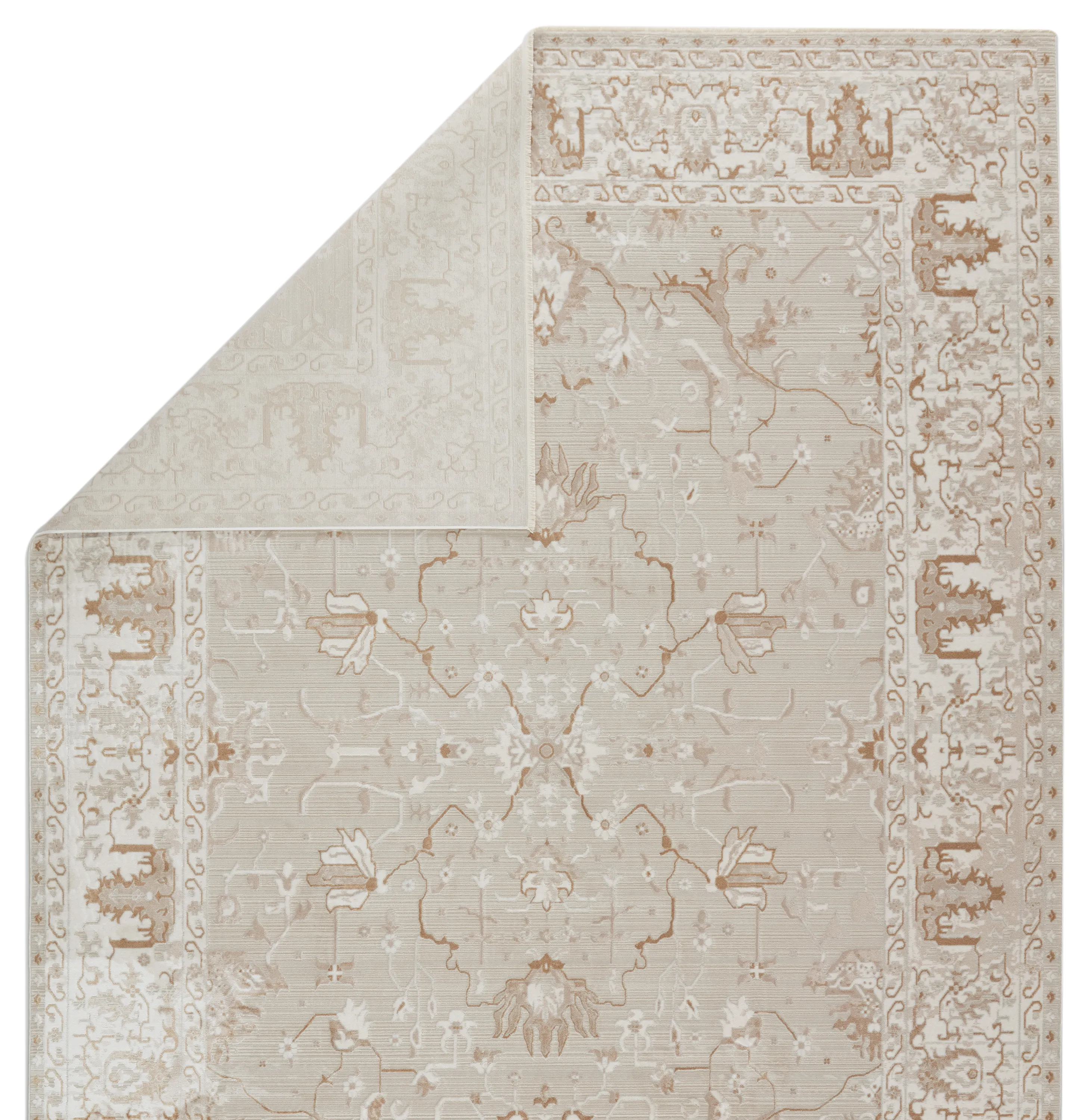 The stunning En Blanc collection captures the elegance of neutral, vintage-inspired patterns and melds Old World aesthetics with an updated and luxurious vibe. The Dhaval rug boasts an ornate vine motif in tones of gray, gold, white, and light taupe. Soft and lustrous, this chameleon-like design emulates the timeless style of a Turkish hand-knotted rug, but in an accessible polyester and viscose power-loomed quality.