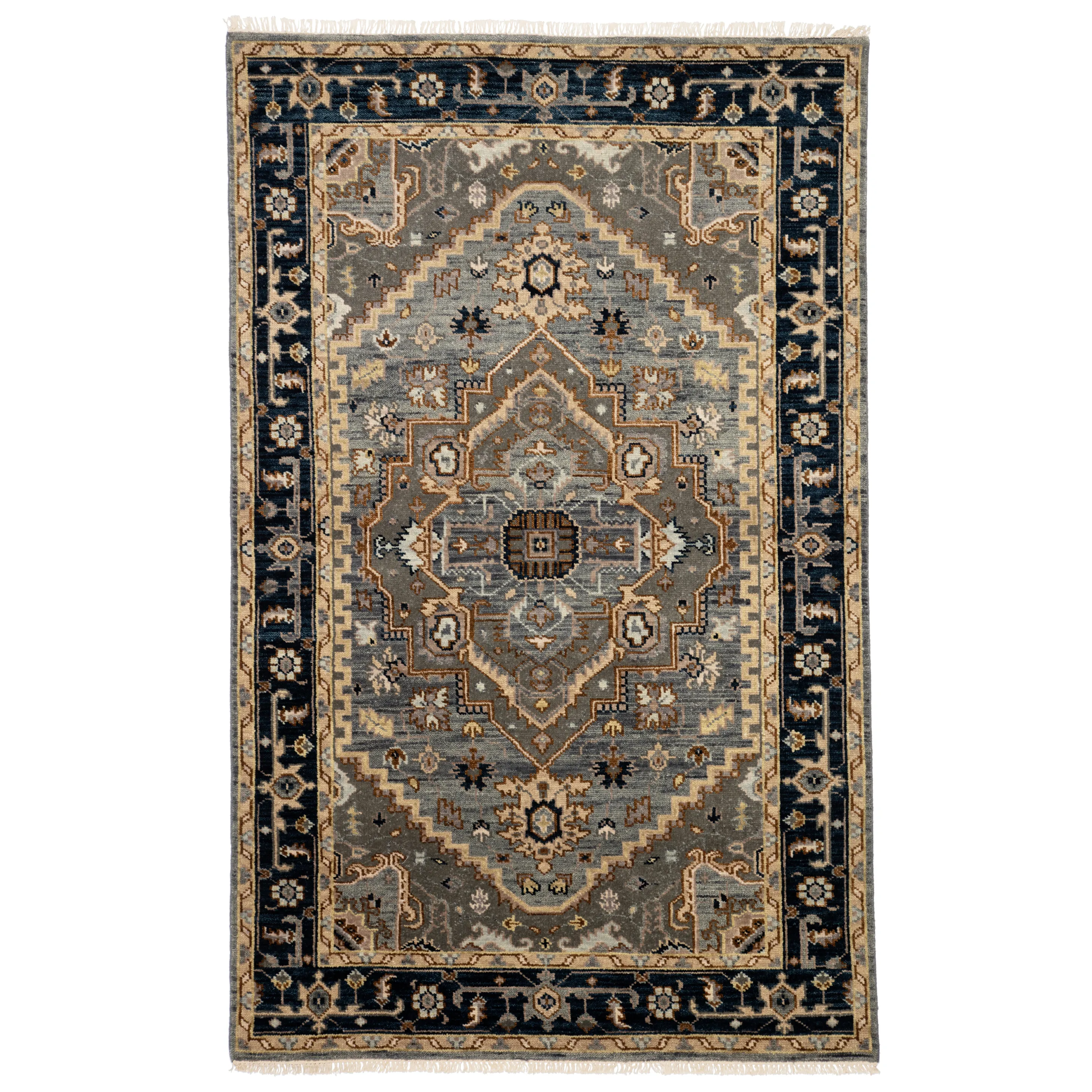 The Liberty collection infuses homes with traditional design and exceptional artisan-made accents. The hand-knotted Andrews rug combines a statement-making center medallion and geometric border for a classically inclined, nevertheless transitional, look. Deep gray and blue hues with pops of yellow and rust brown create an inviting color palette on this durable wool rug.