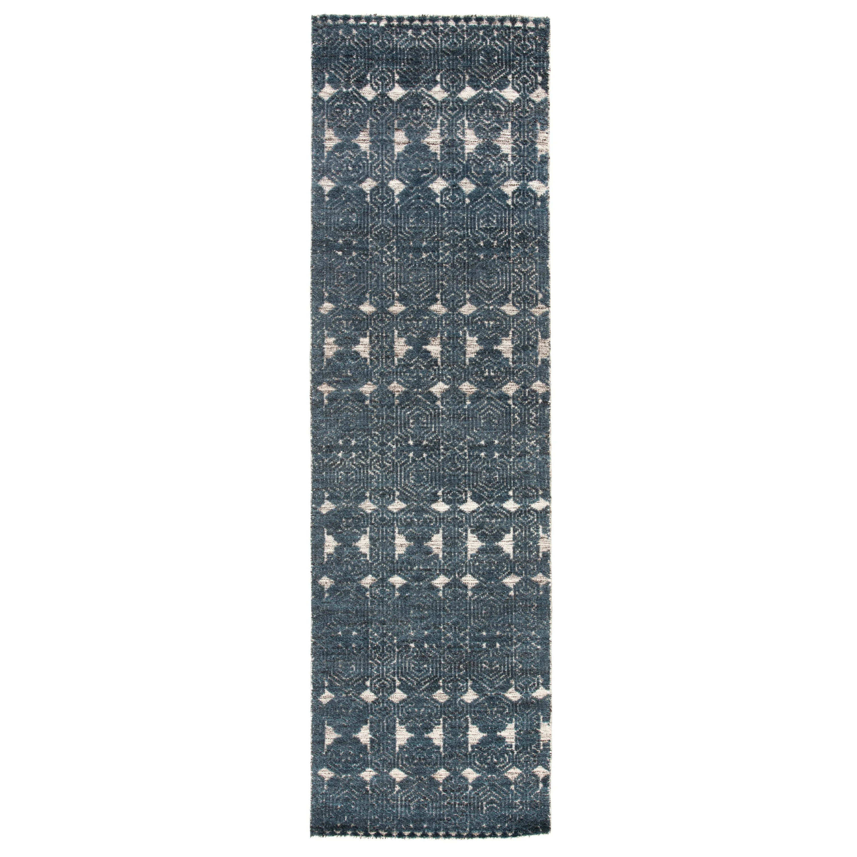 An intricate design and hand-knotted craftsmanship define the exceptional beauty of this stunning area rug. This wool, viscose, and cotton accent boasts a detail-rich medallion motif, forming a captivating repeating pattern in deep blue, brown, and white hues.