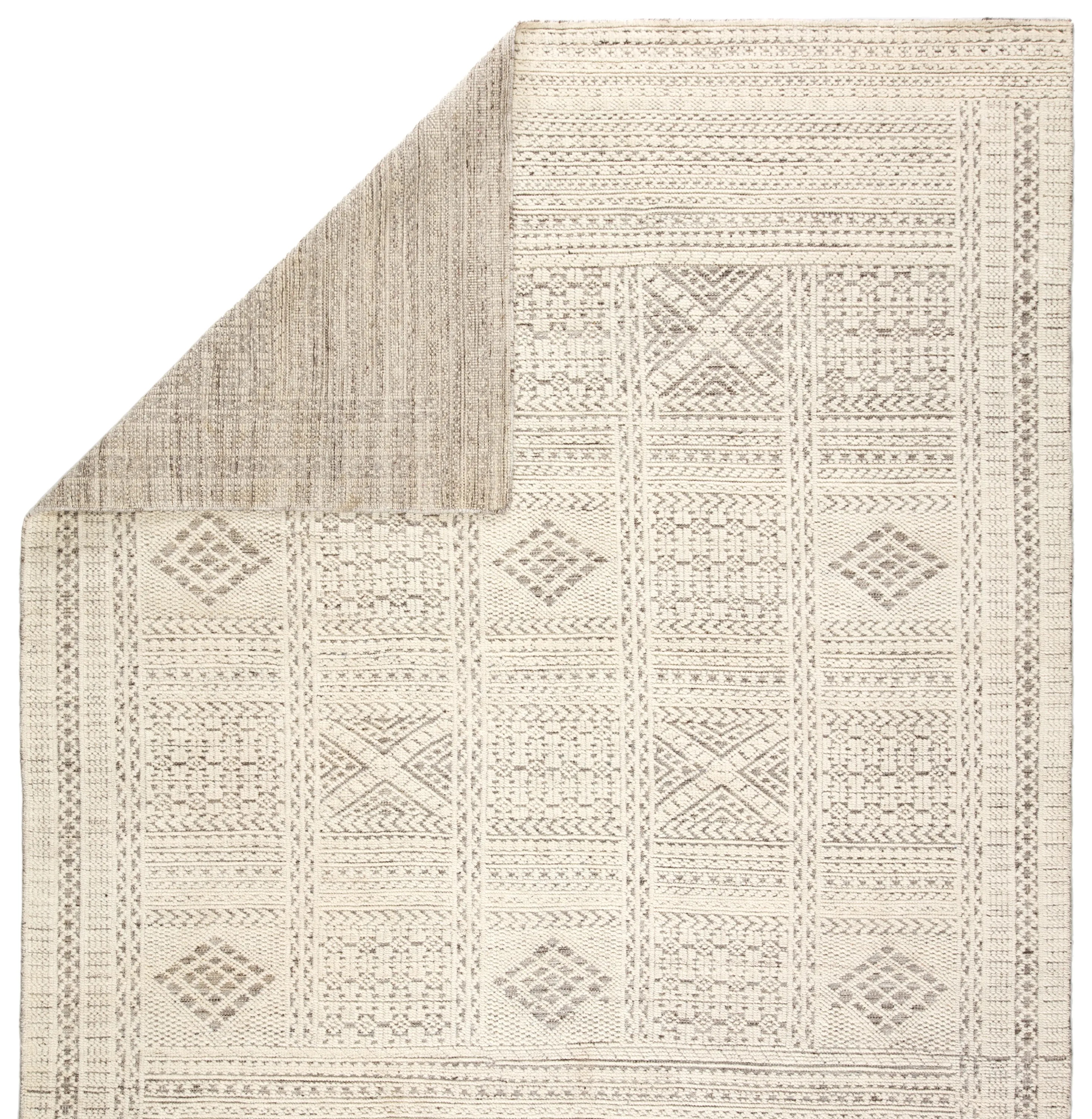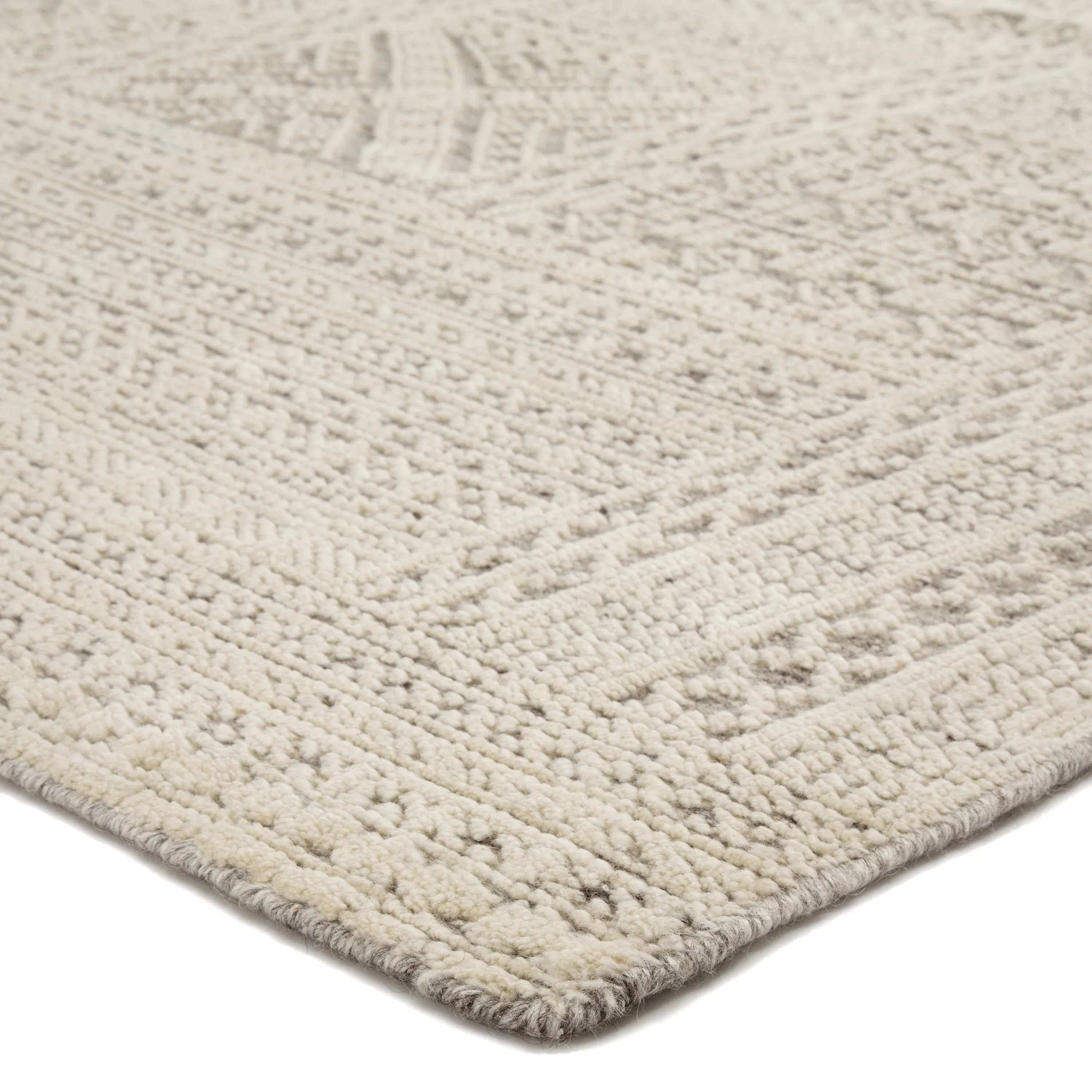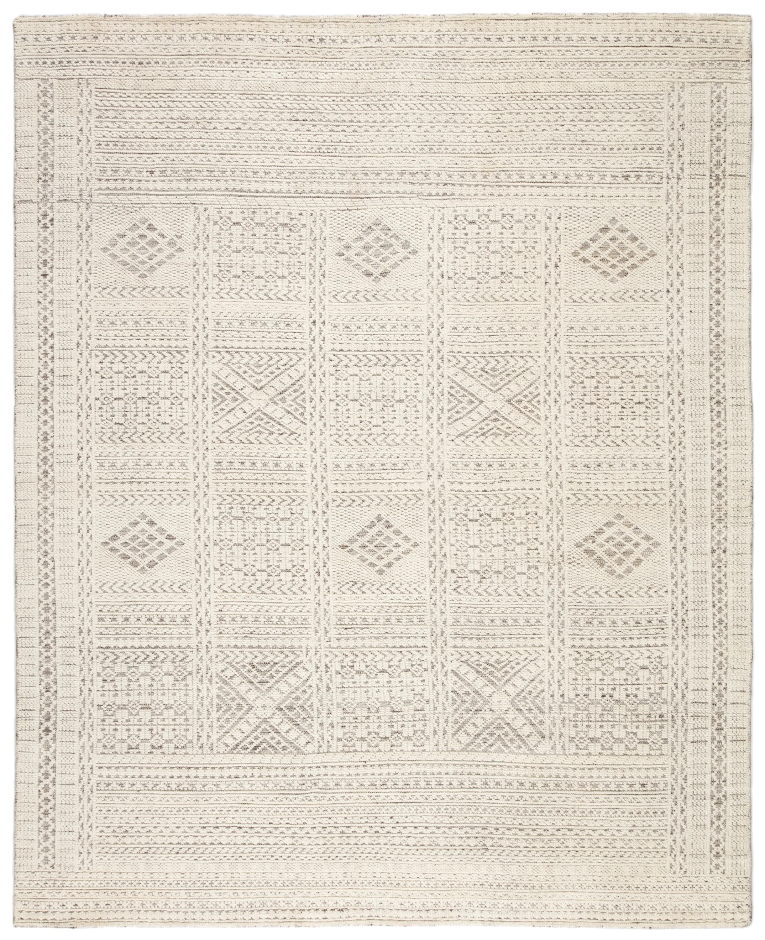The captivating Reign collection introduces detail-rich design and inviting carved pile to contemporary and traditional homes alike. The hand-knotted Jadene rug boasts an intricate geometric design in a neutral ivory and light gray colorway. This wool rug's textured pattern grounds spaces with striking depth and dimension.
