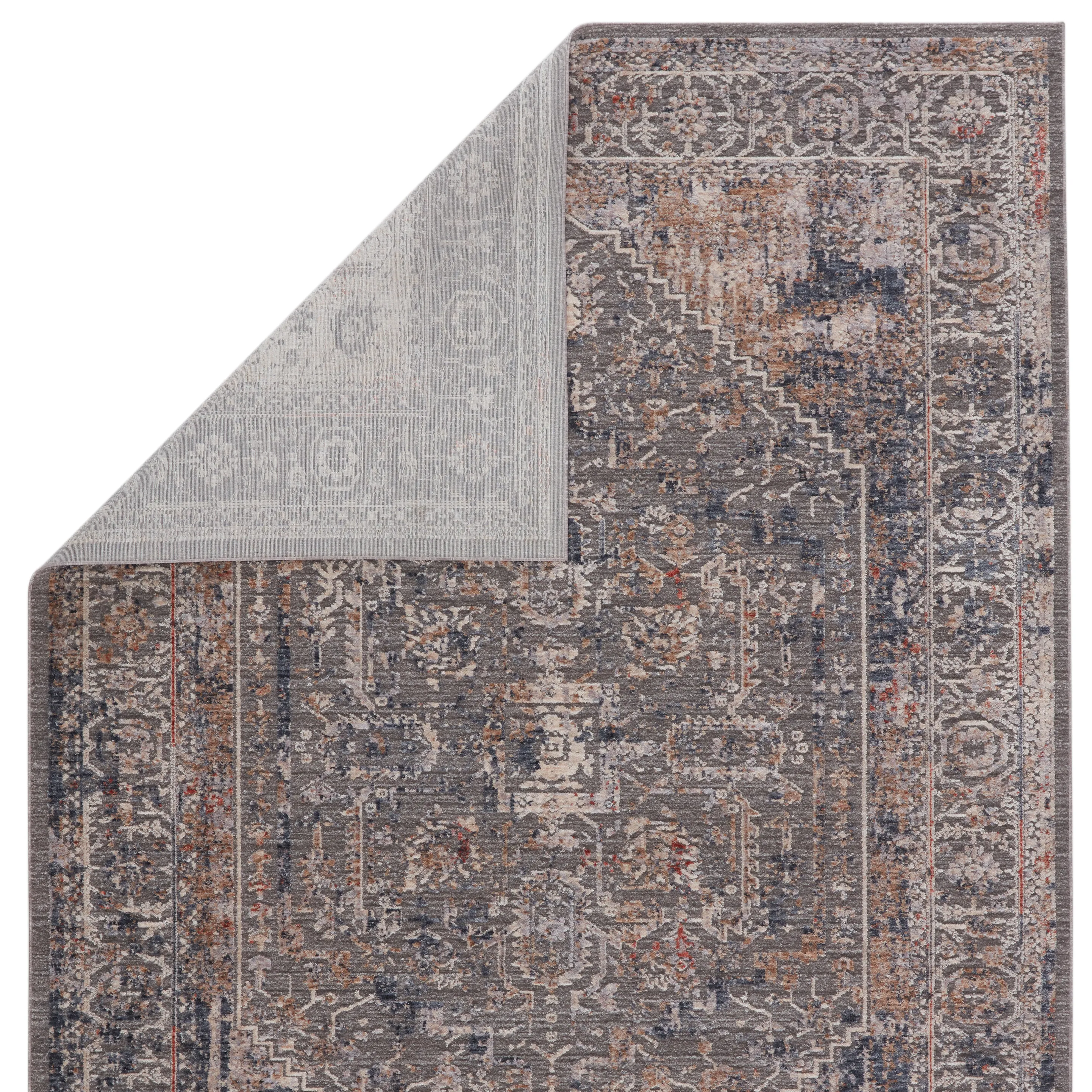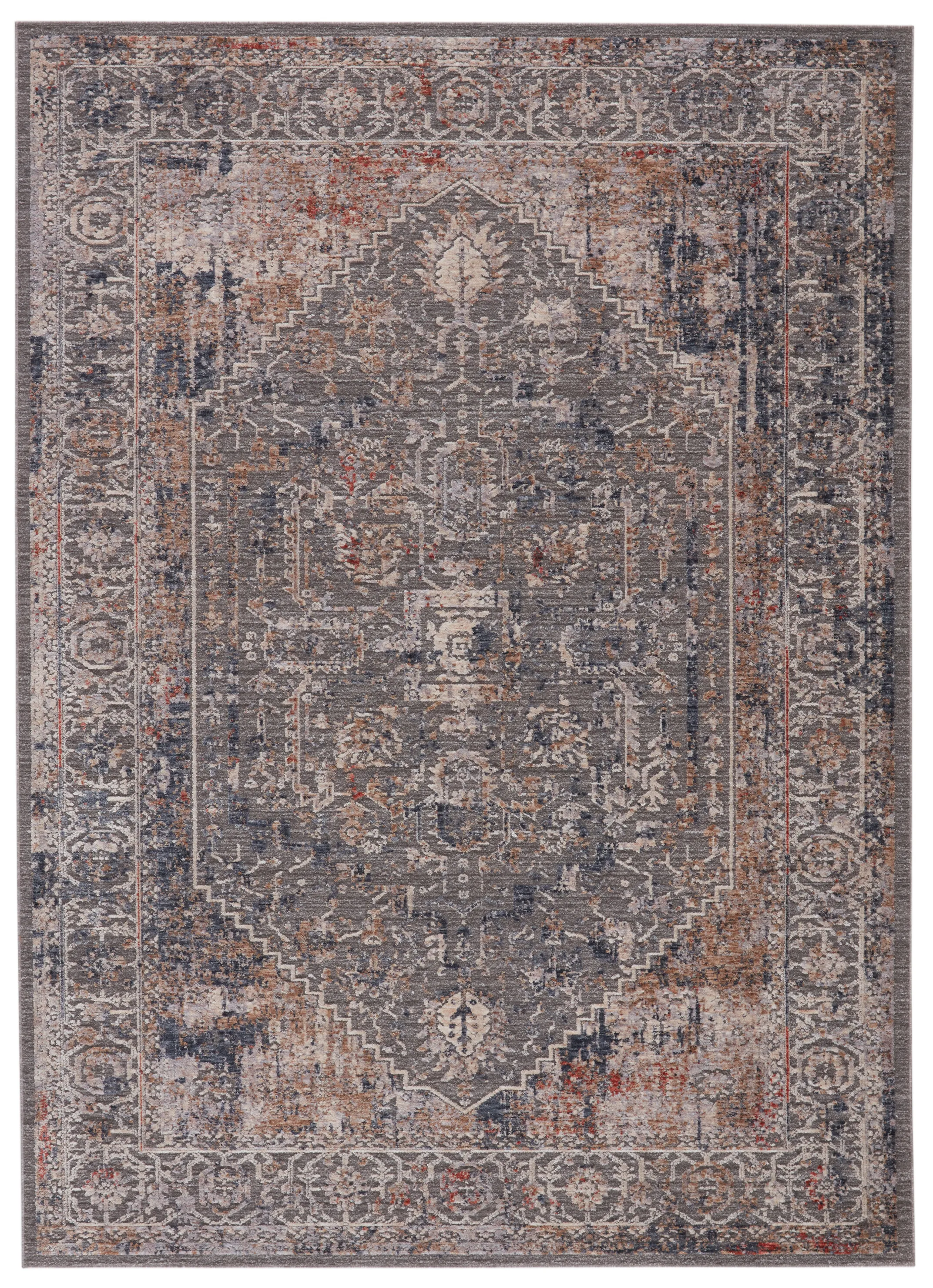 Beautifully textured to emulate vintage textiles, the Raveen collection combines the carved, detailed look of handmade rugs with the contemporary touch of power-loomed innovation. The Valle rug features an ornate center medallion in tones of gray, cream, blue, golden tan, and hints of red. This polyester rug is durable, resistant to stains, and perfect for high-traffic areas.