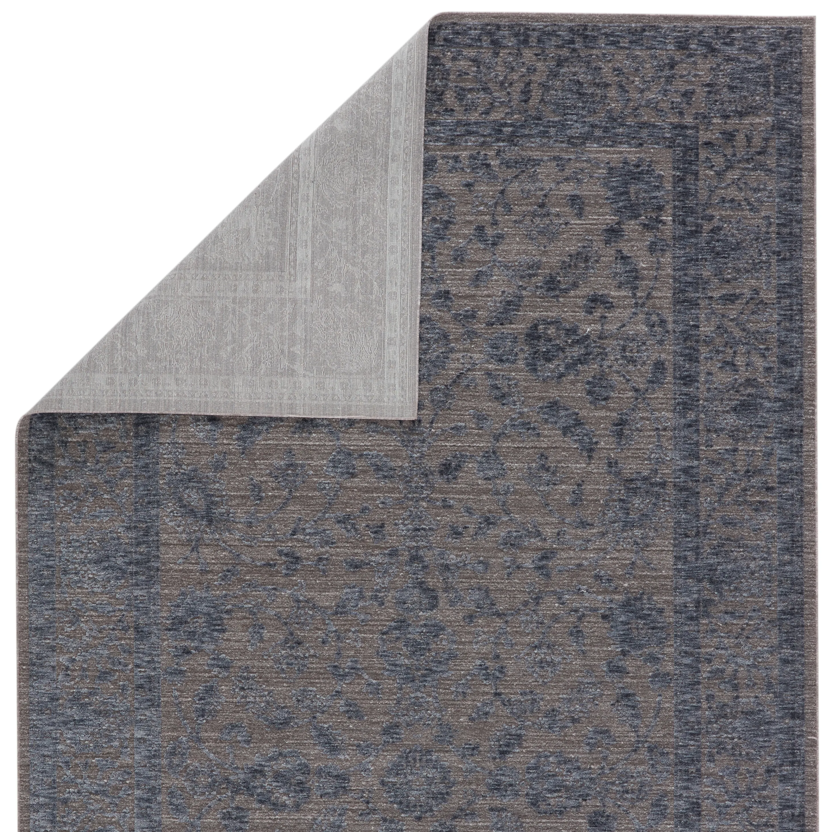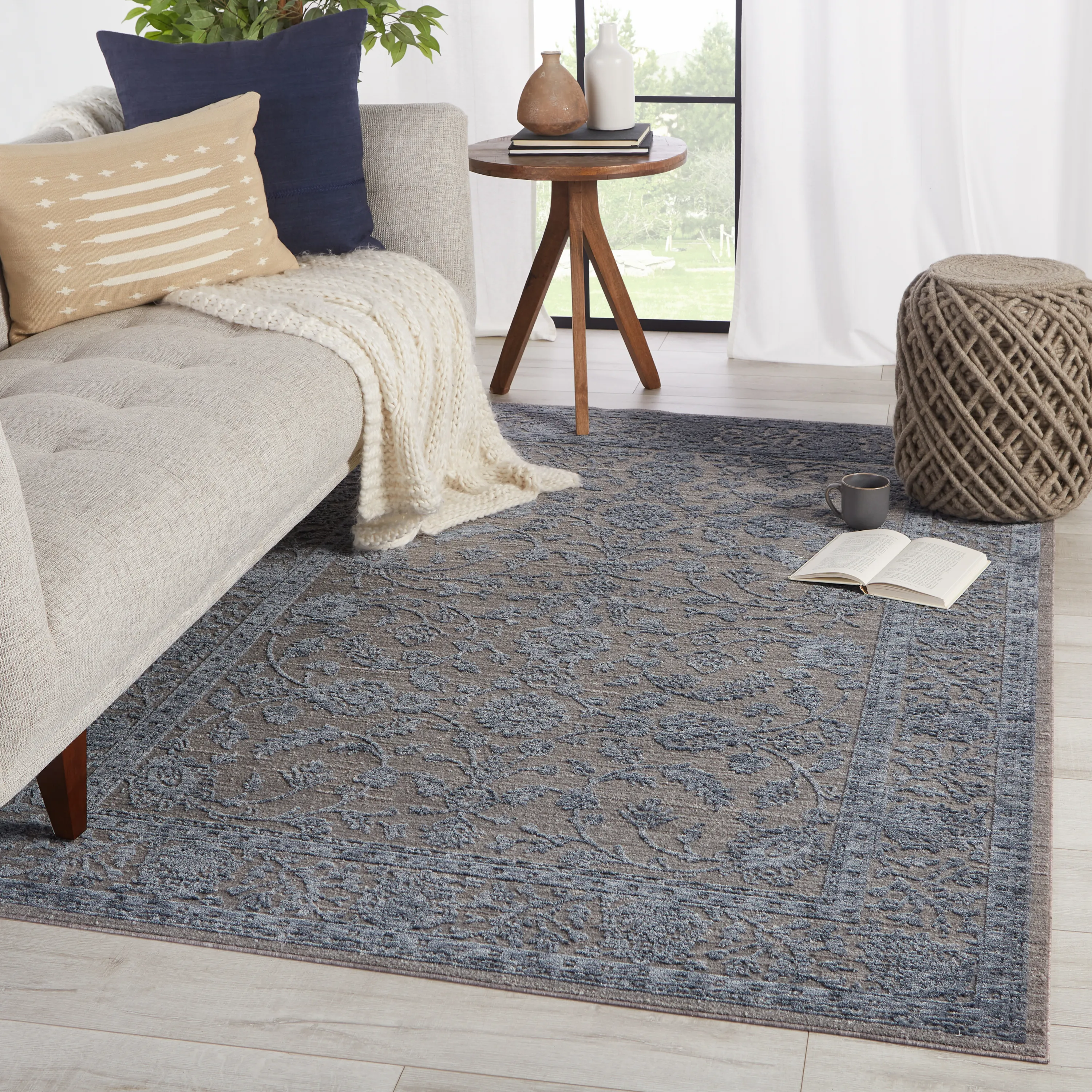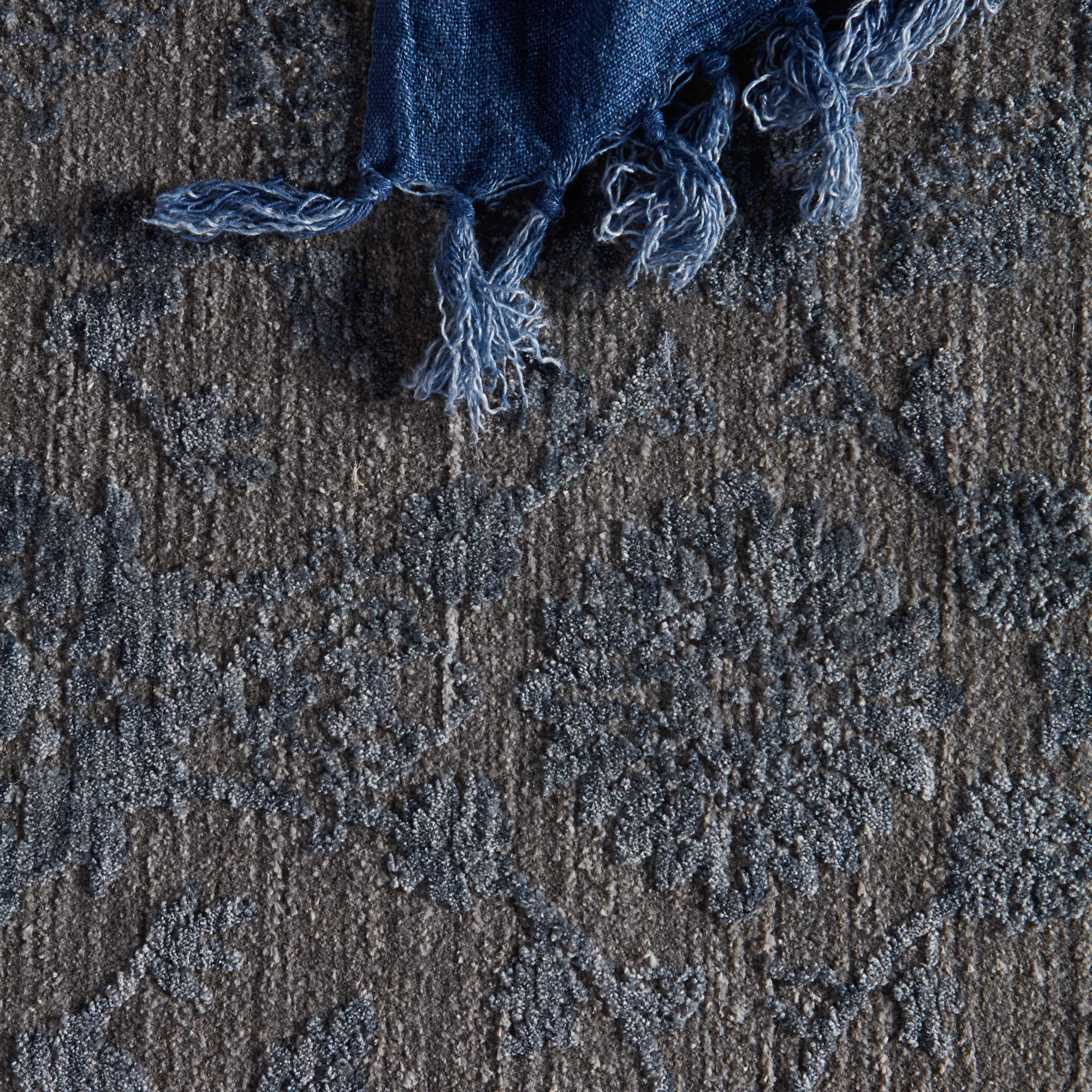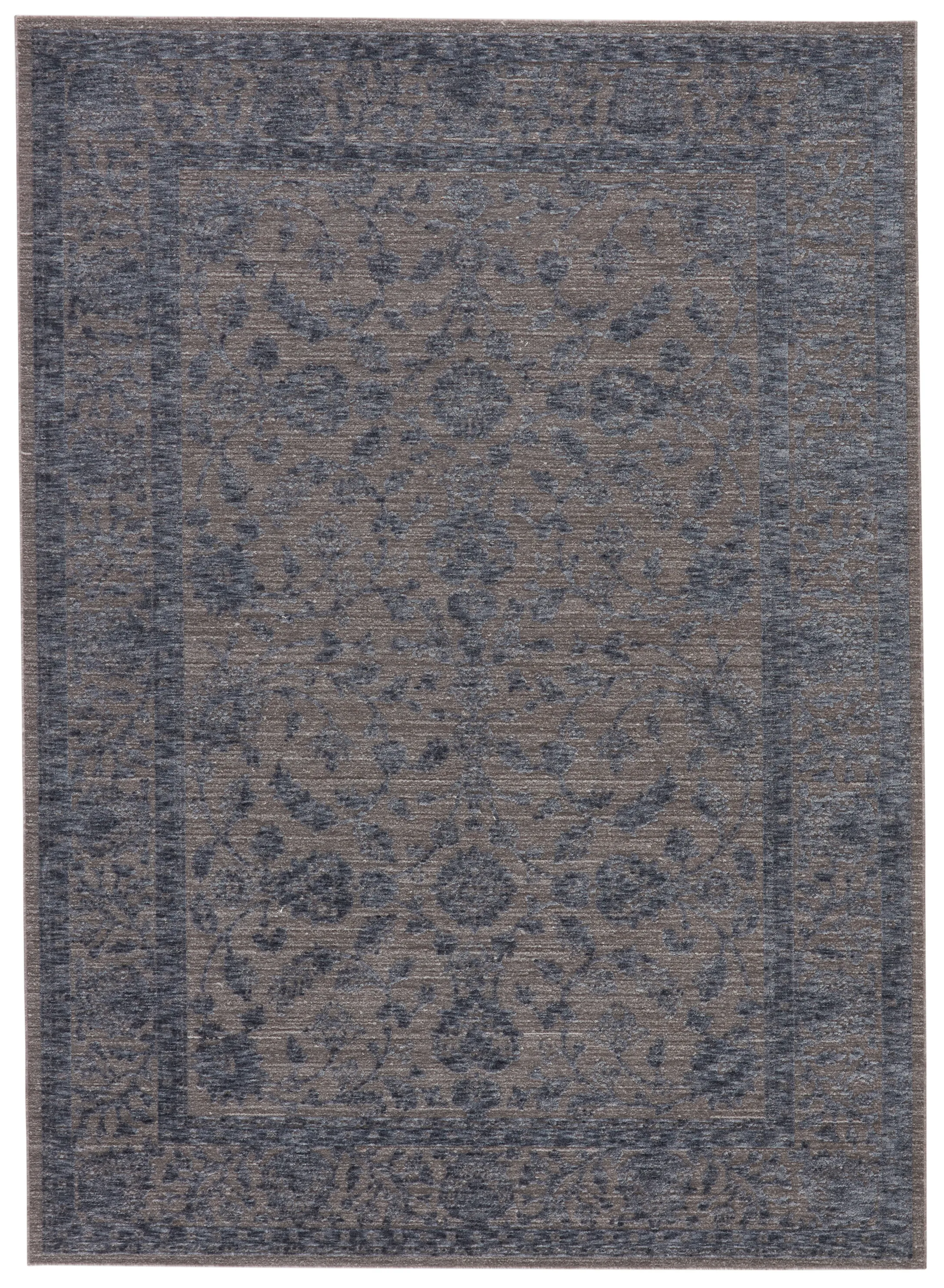 Beautifully textured to emulate vintage textiles, the Raveen collection combines the carved, detailed look of handmade rugs with the contemporary touch of power-loomed innovation. The Valle rug features an ornate floral motif in serene, deep tones of gray and blue. This polyester rug is durable, resistant to stains, and perfect for high-traffic areas.