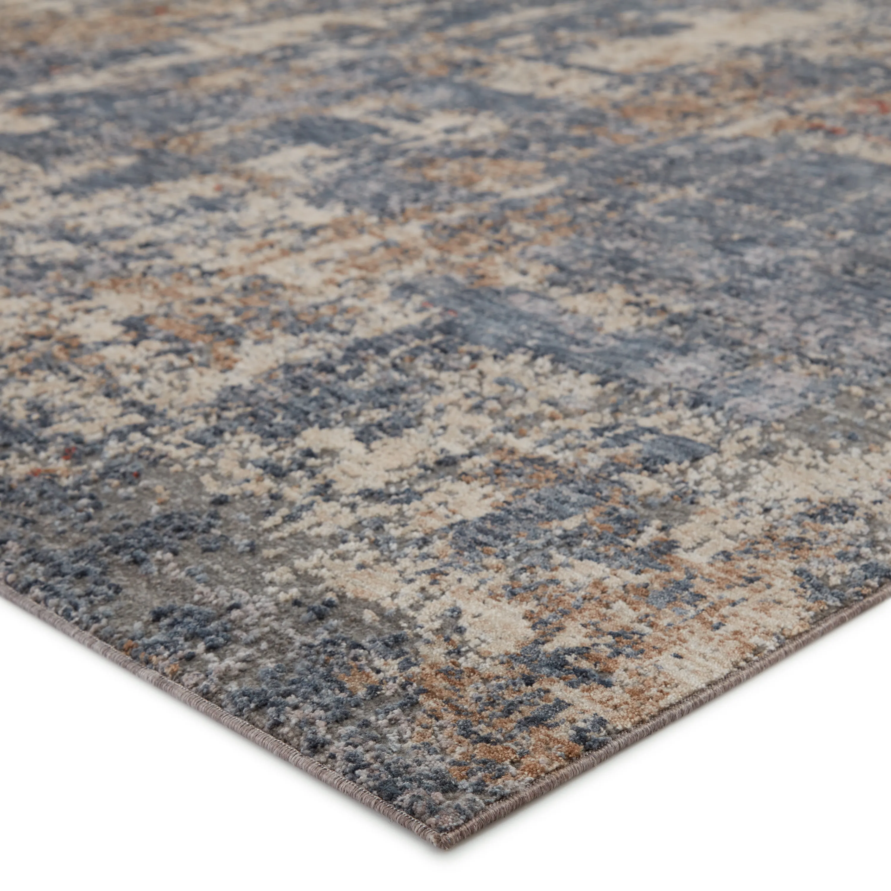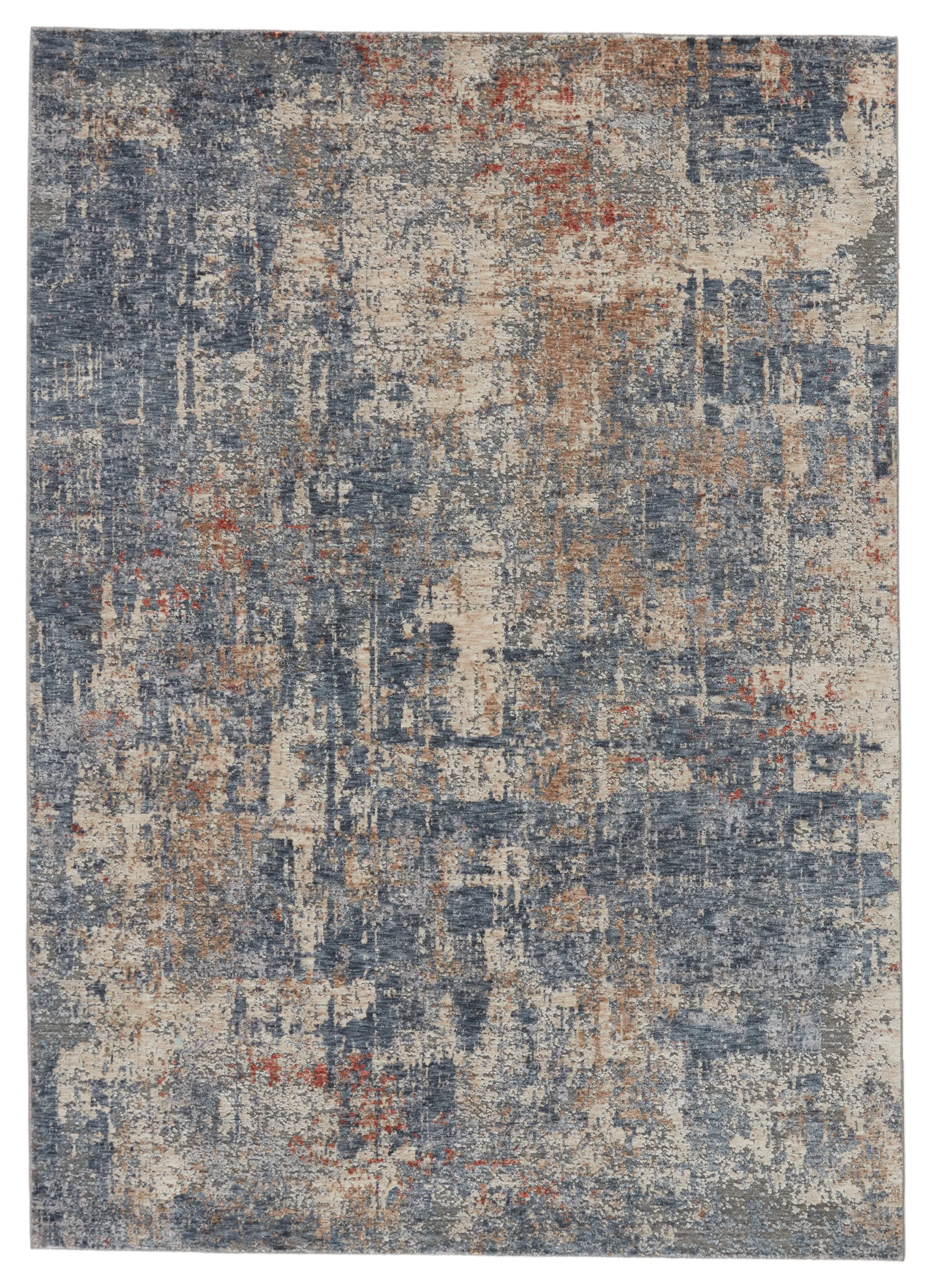 Beautifully textured to emulate vintage textiles, the Raveen collection combines the carved, detailed look of handmade rugs with the contemporary touch of power-loomed innovation. The Temecula rug features an artistically distressed abstract motif in tones of blue, cream, gray, golden tan, and hints of red. This polyester rug is durable, resistant to stains, and perfect for high-traffic areas.
