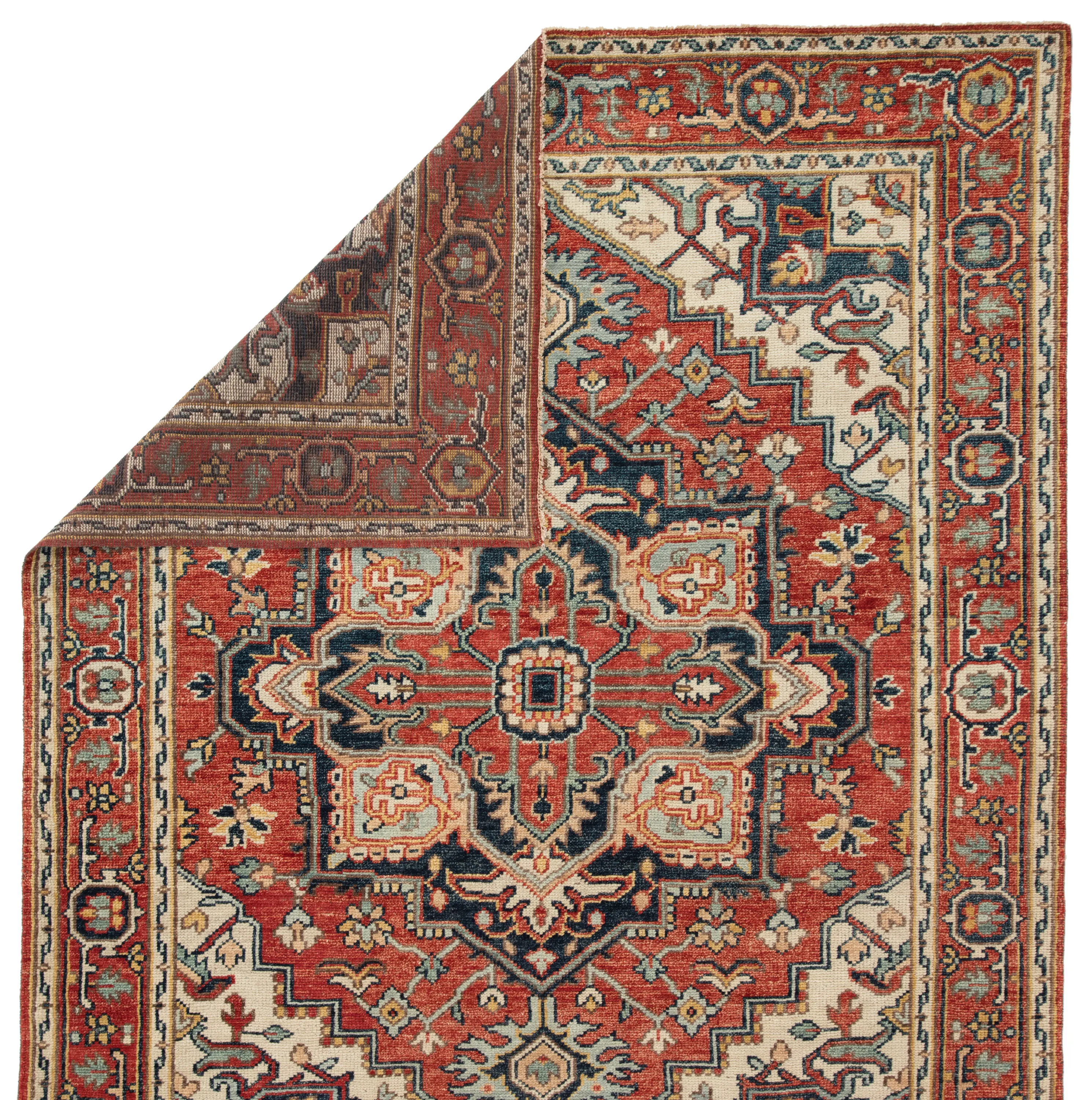 The Salinas collection is punctuated by vibrant hues and intricate details, bringing a bold, transitional look to any home. The hand-knotted Willa rug expresses classic, Serapi style with an intricate center medallion and surrounding border. Rich tones of blue and red ensure a timeless look, while the durable wool construction provide an heirloom-quality accent.
