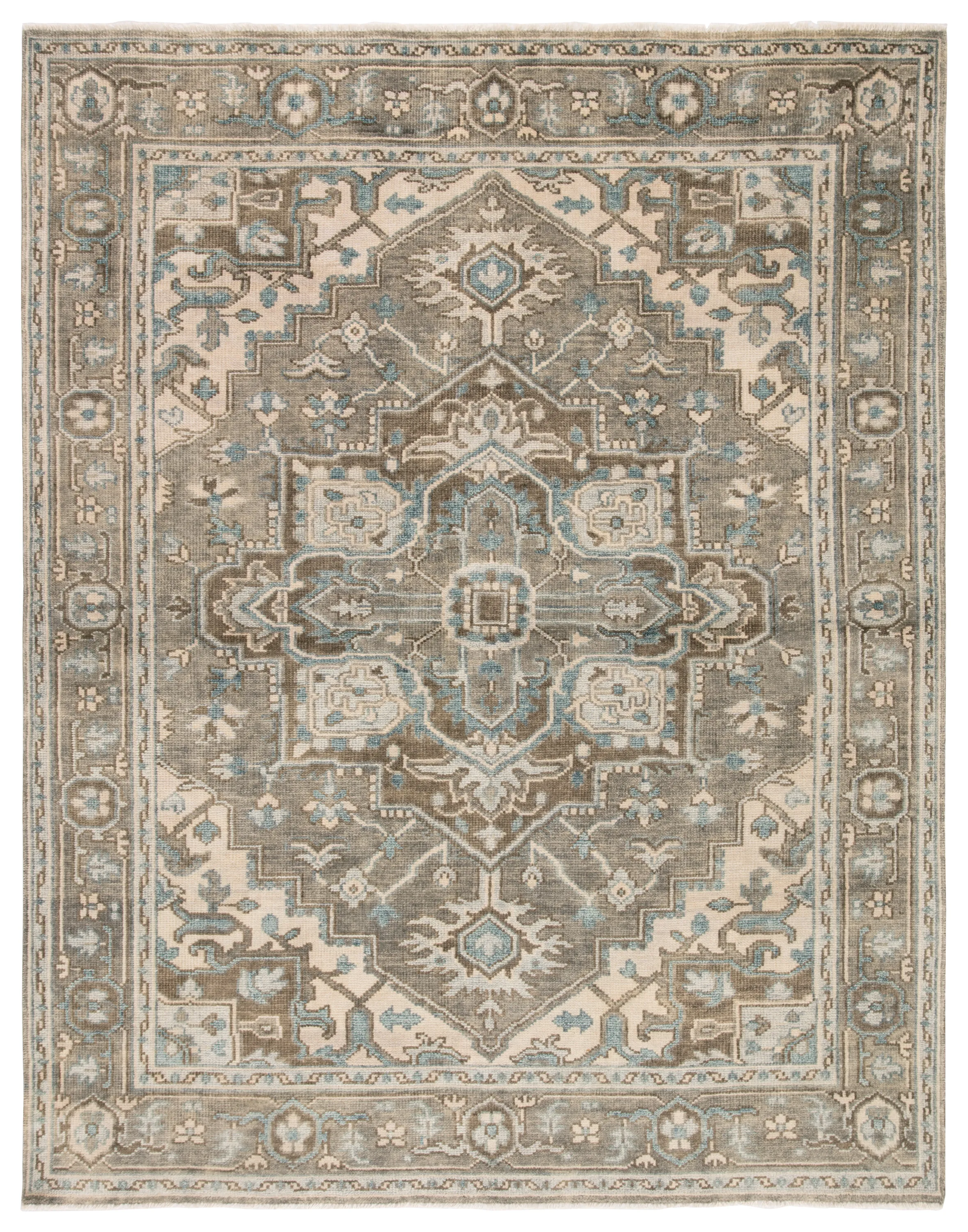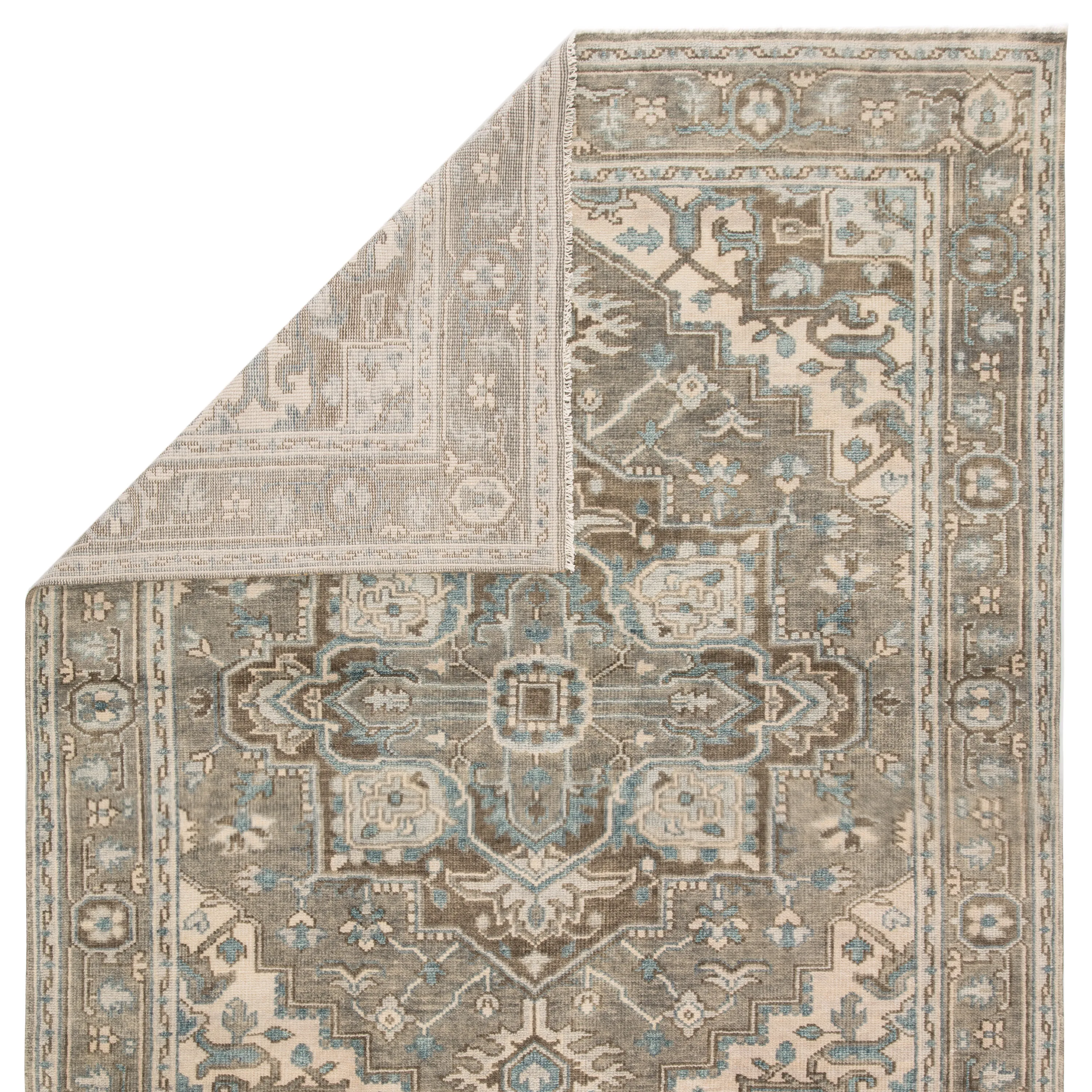 The Salinas collection is punctuated by traditional, intricate details and a soft, hand-knotted wool construction. The neutral Flynn rug combines an ornate center medallion with elegant scrolling accents for a versatile and grounding look. This durable, artisan-made rug boasts a subtle pop of sky blue for a serene color story.