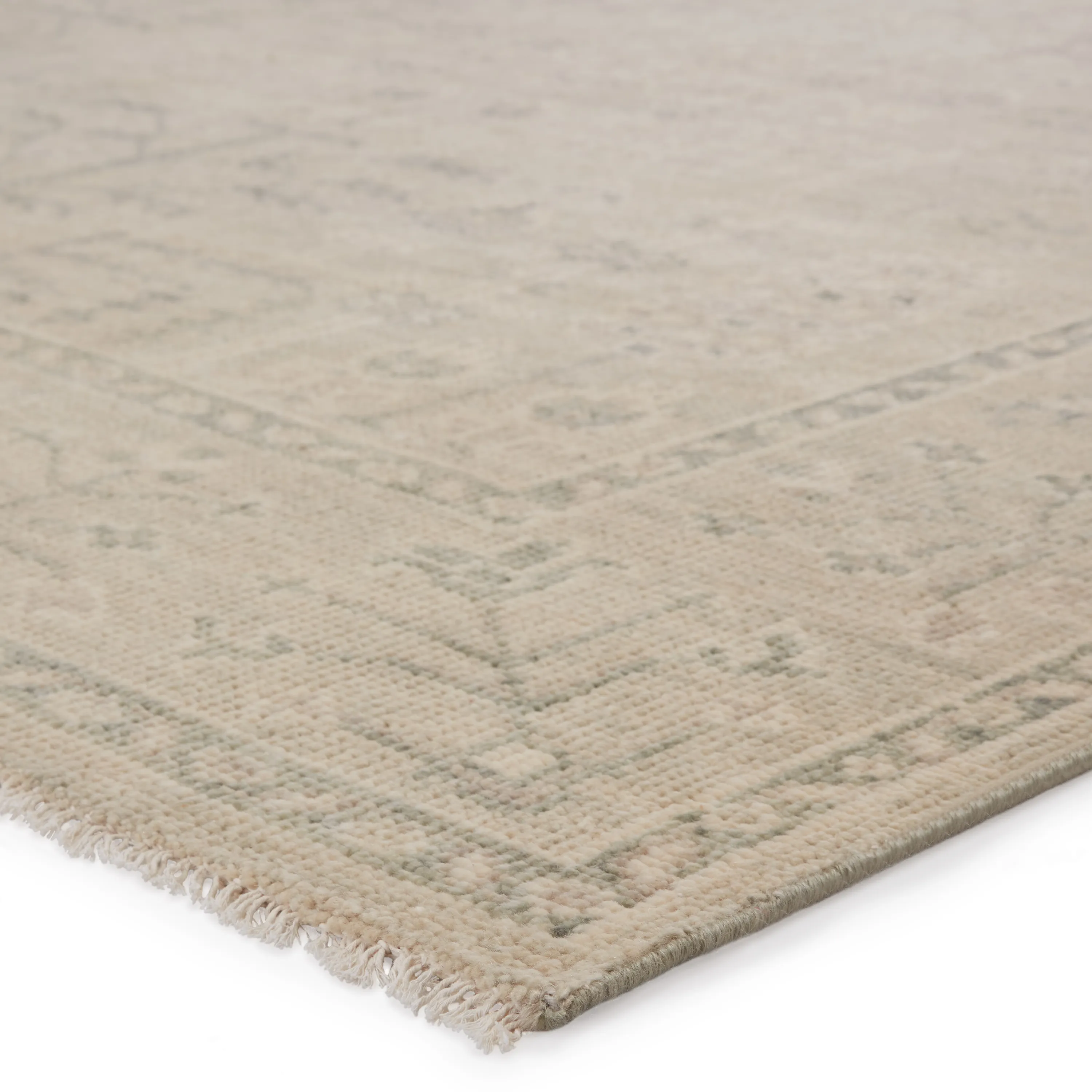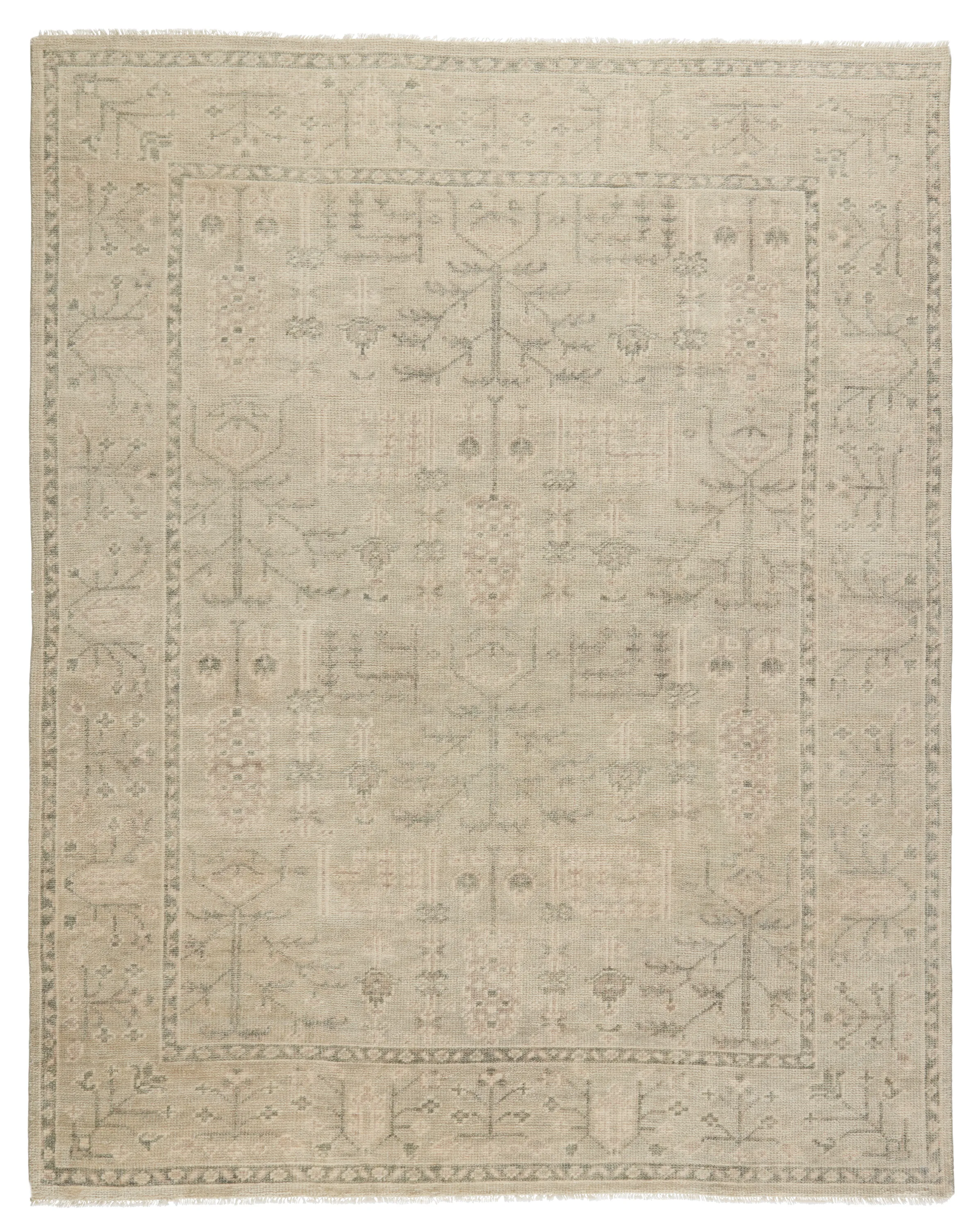 The Salinas collection is punctuated by traditional, intricate details and a soft, hand-knotted wool construction. The neutral Ginerva rug makes a transitional statement with green-gray and cream hues and vintage motifs. This durable, artisan-made rug boasts a distressed look for an Old World vibe in contemporary spaces.