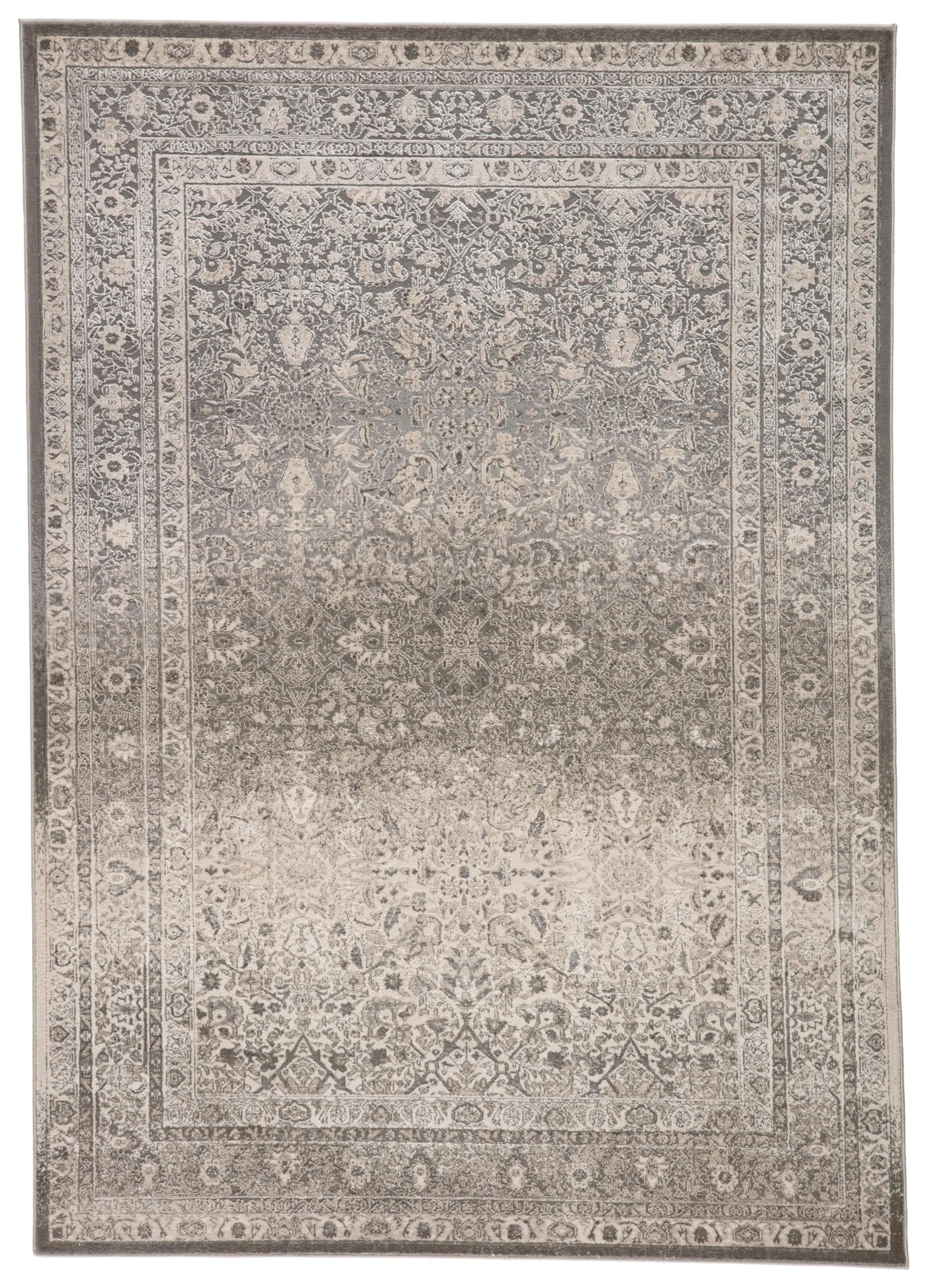 The Sinclaire collection is a vintage-inspired assortment of faded traditional designs for a casual yet glam statement. The Safiyya rug boasts an intricate Oriental motif with lustrous metallic details and a cream, gray, and silver colorway. The sleek polyester and polypropylene fibers of this luxe rug lend a chameleon-like shine, offering the unique blend of modernity and timeless distressing.