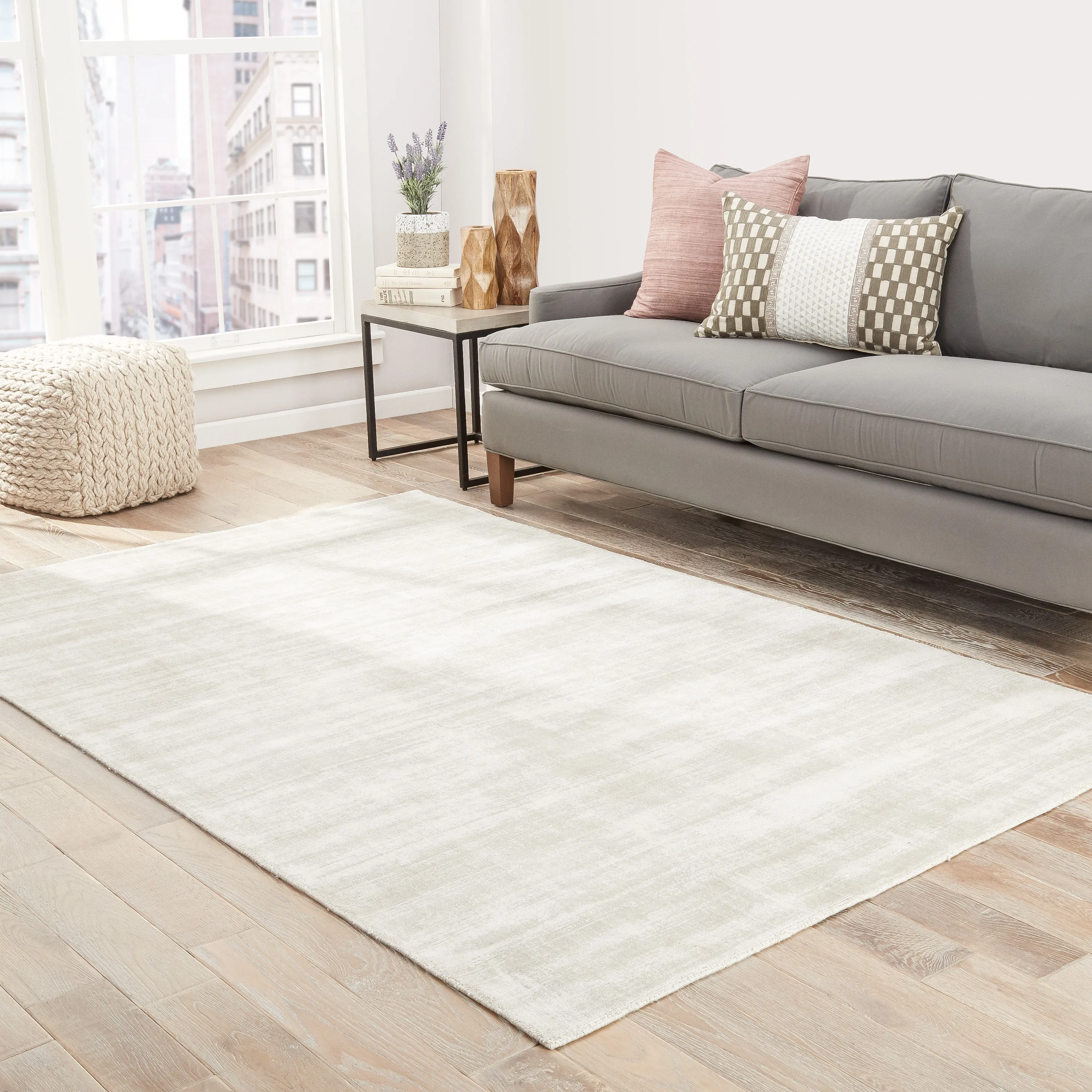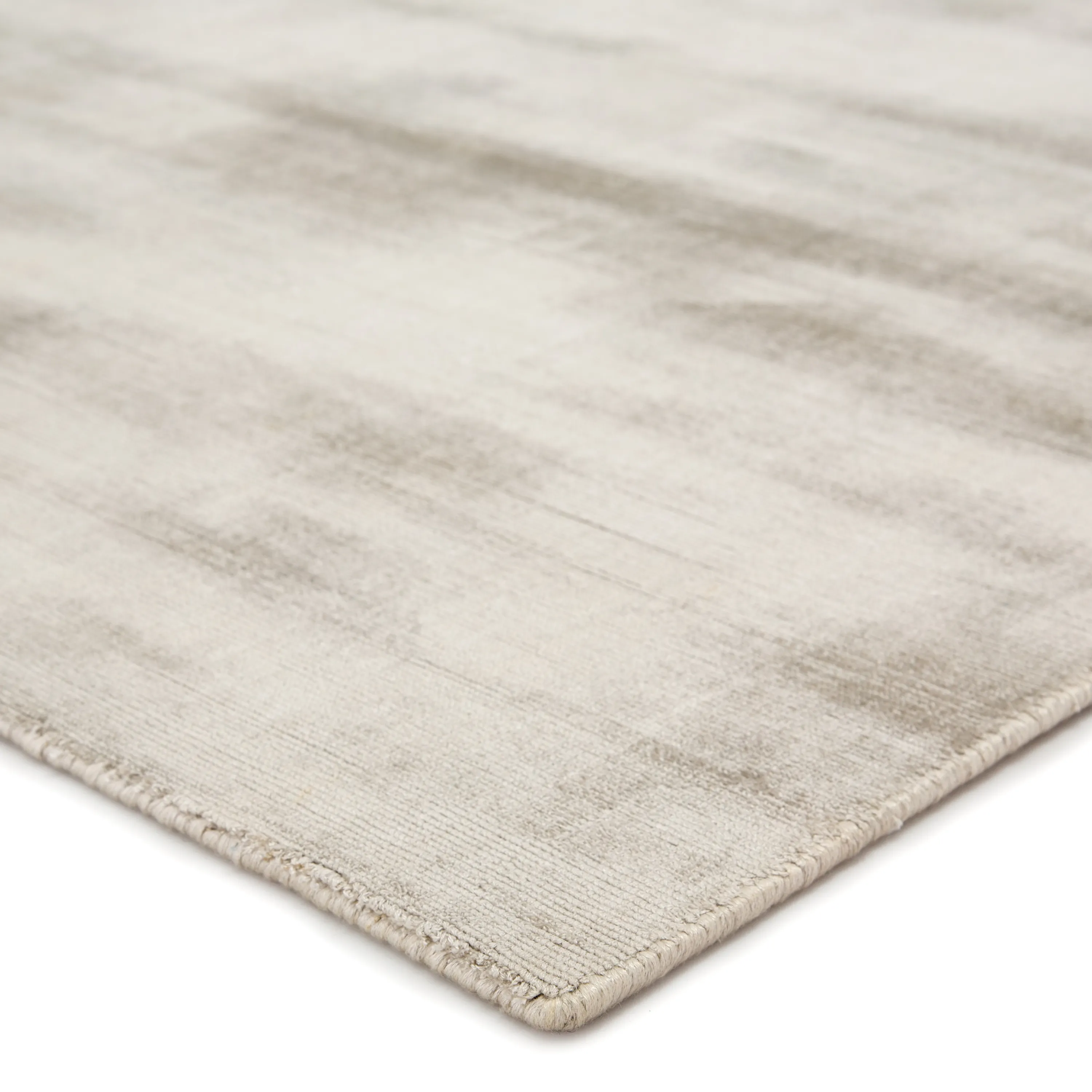 Effortless luxury defines this alluring and stunningly soft hand-loomed viscose area rug. The perfect accent for a glamorous bedroom, this solid silver layer boasts a dazzling luster and artistically distressed design.