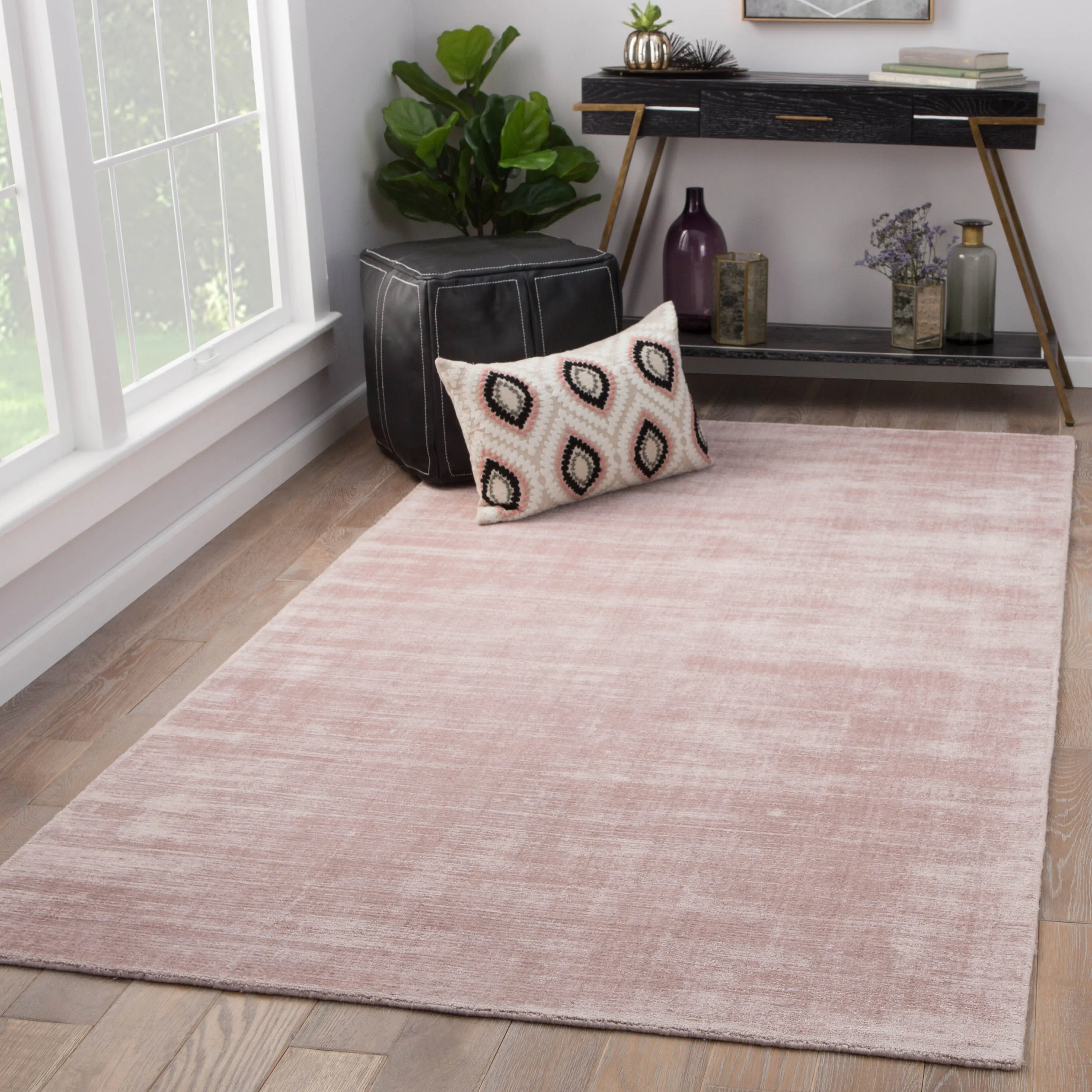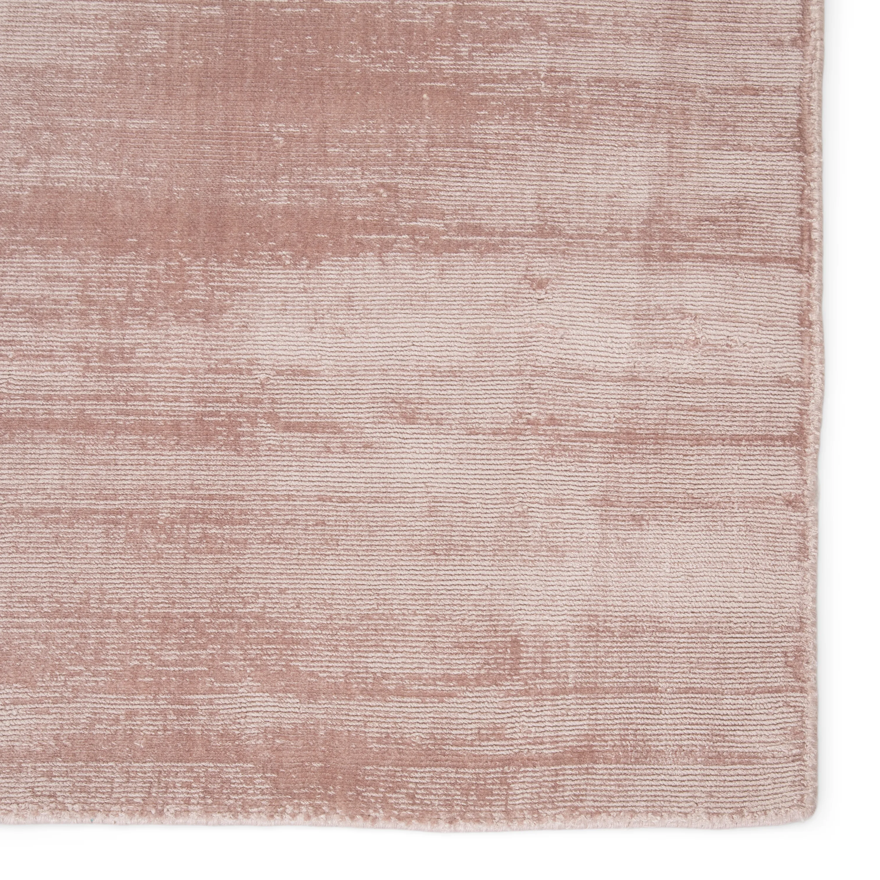 Effortless luxe defines this alluring and stunningly soft hand-loomed viscose area rug. The perfect accent for a glamorous bedroom, this solid blush pink layer boasts a dazzling luster and artistically distressed design.