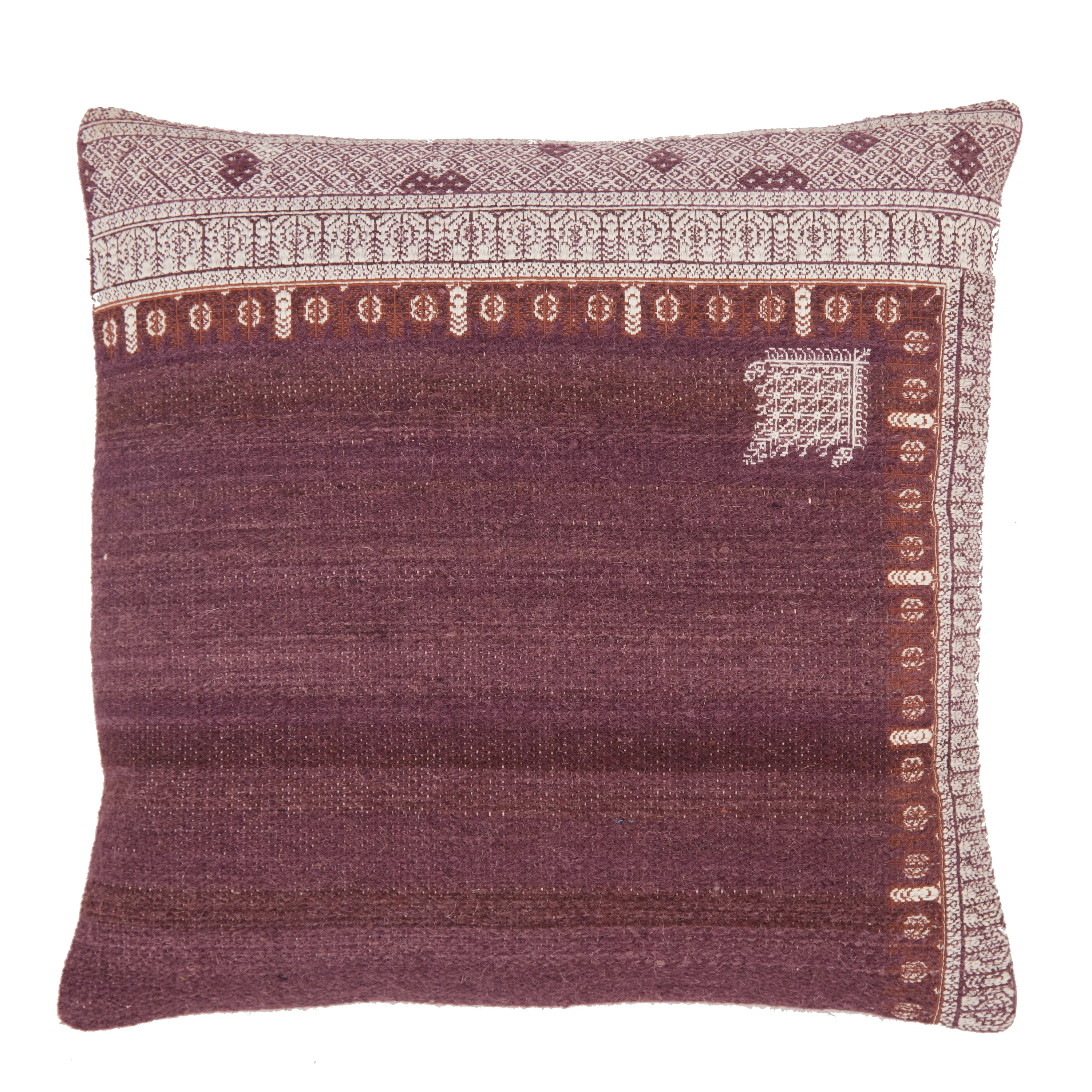 Inspired by Moroccan Sabra styles, the Puebla collection boasts vibrant color palettes and intricate tribal embroidery. The Rania throw pillow features a deep plum colorway with bright white details accenting the textural, India-sourced wool and cotton weave.