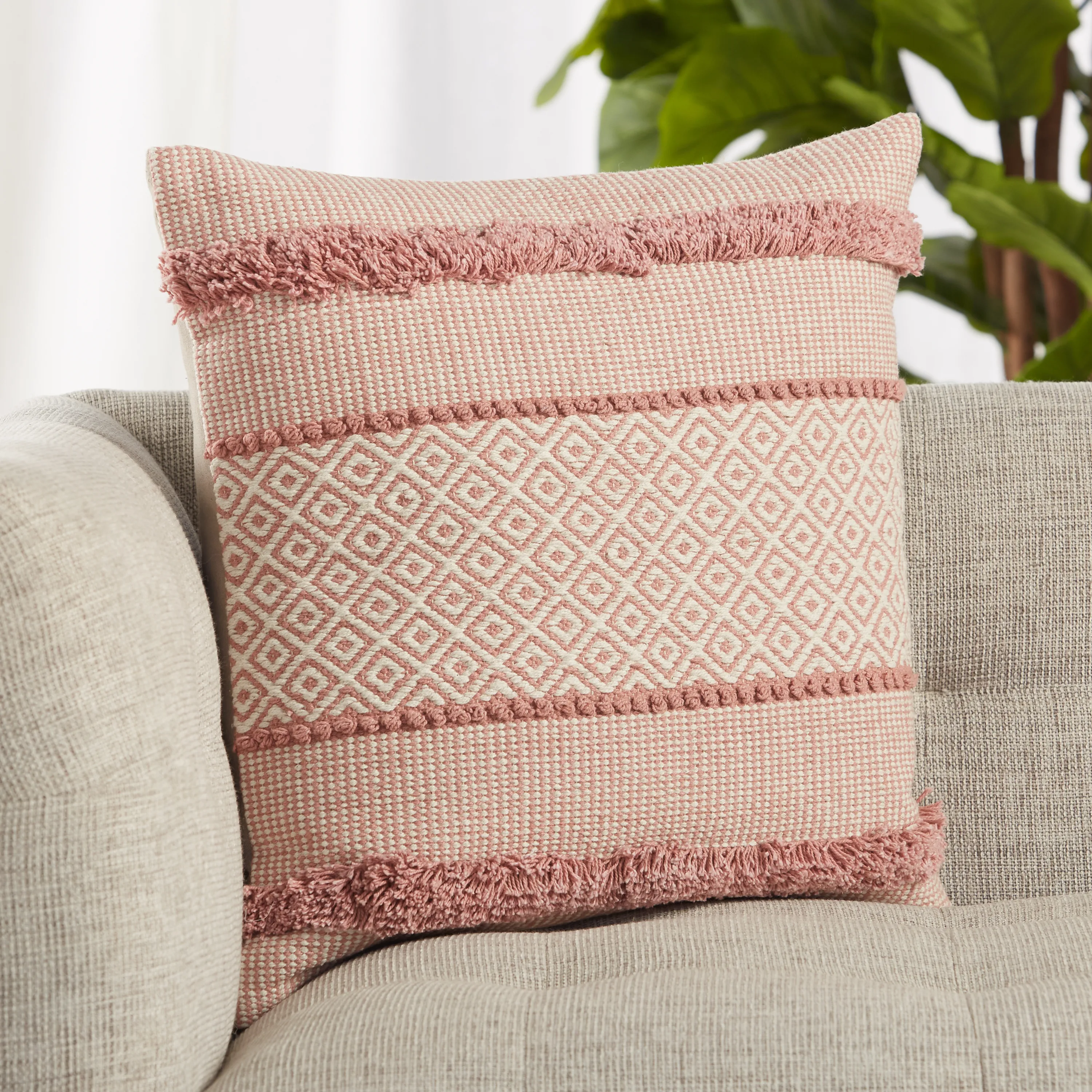 The Parable collection features Southwestern vibes and easy-going, fresh style. The Imena throw pillow showcases a diamond lattice motif and tufted trim details in chic tones of pink and white. Crafted of textural cotton, this light and neutral accent boasts bohemian touches and relaxed, cozy feel.