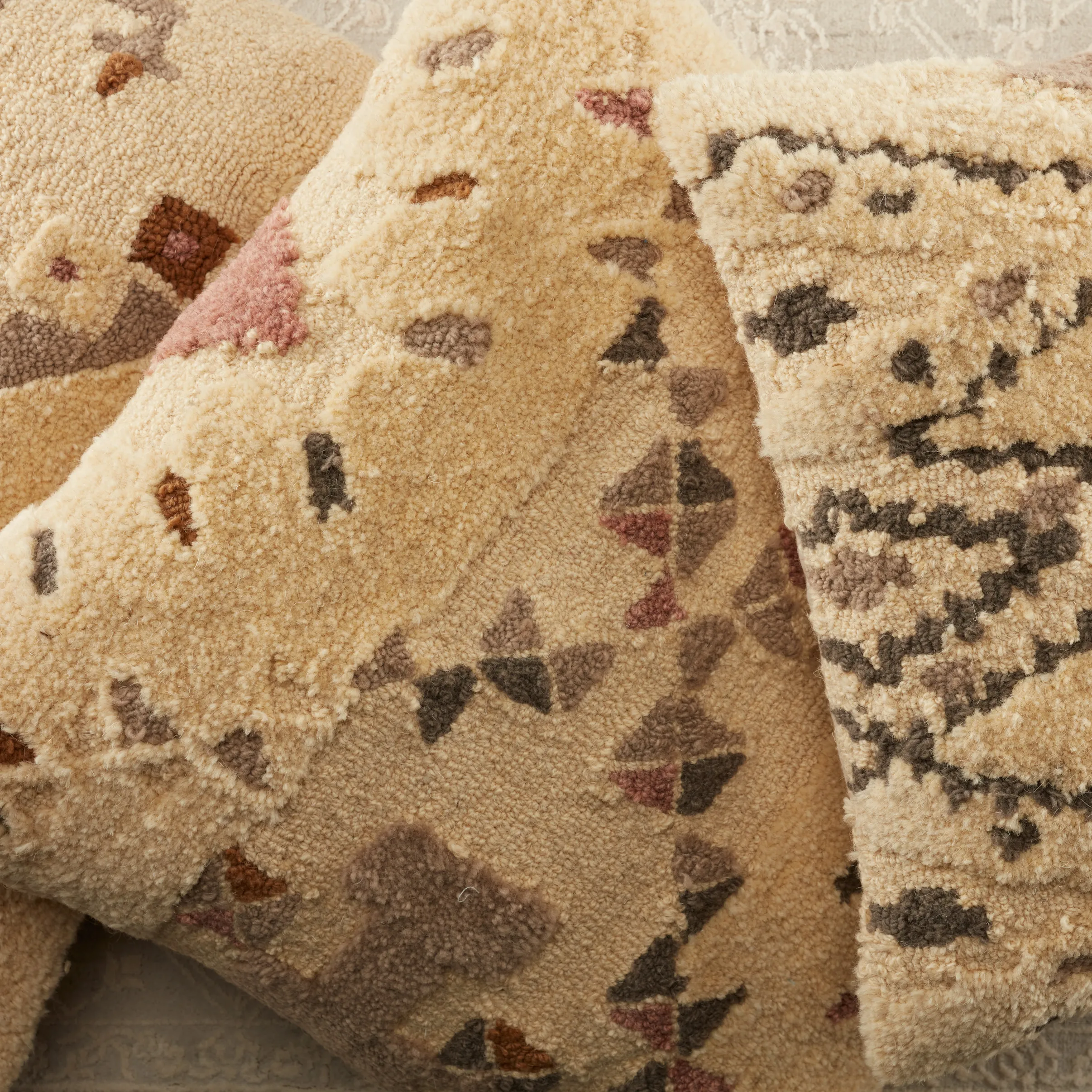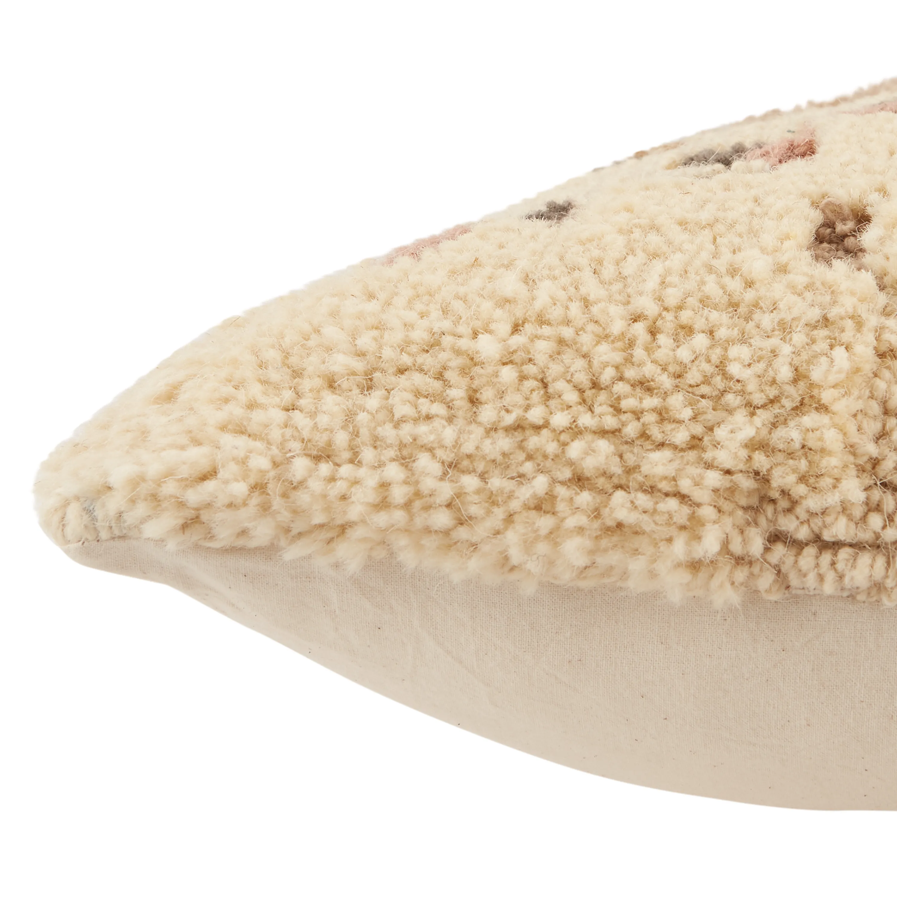 The Soul Trek pillow collection offers plush, woolen texture and a modern nomadic vibe to any space. The Meja throw pillow features a cozy, earthy design crafted of wool and polyester. The light tones of cream, light pink, mauve, terra cotta, and gray offer this globally inspired accent a fresh, contemporary touch.