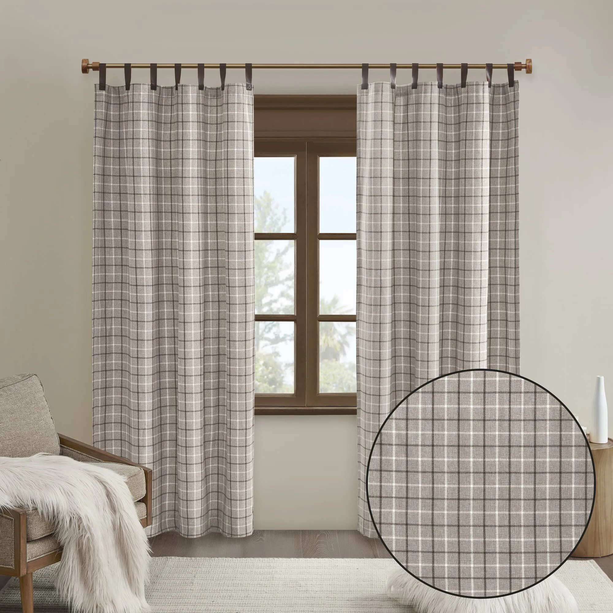 The Madison Park Anaheim Plaid Faux Leather Tab Top Panel with Fleece Lining brings a stylish, rustic charm to your living space. Its rich brown plaid pattern on heavyweight fabric creates a cozy ambiance while the brown faux leather tab top adds a distinctive decorator's flair. An added fleece lining enhances privacy and thermal insulation, without blocking natural sunlight. Available in 50" W and 84” L, these machine-washable panels are sold individually. For standard size windows, two panels are recommended.