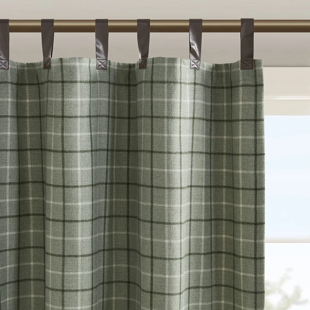 The Madison Park Anaheim Plaid Faux Leather Tab Top Panel with Fleece Lining brings a stylish, rustic charm to your living space. Its rich charcoal plaid pattern on heavyweight fabric creates a cozy ambiance while the brown faux leather tab top adds a distinctive decorator's flair. An added fleece lining enhances privacy and thermal insulation, without blocking natural sunlight. Available in 50" W and 84" Ls, these machine-washable panels are sold individually. For standard size windows, two panels are recommended.