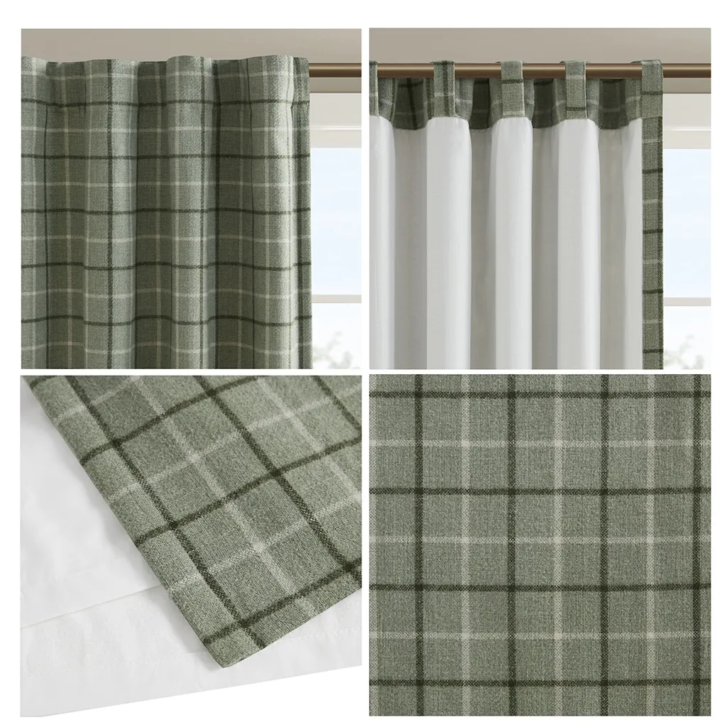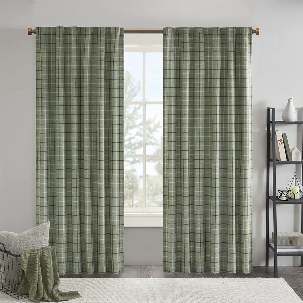 The Madison Park Anaheim Plaid Rod Pocket and Back Tab Panel with Fleece Lining is an effortlessly stylish and casual addition to your home decor, perfect for creating a cozy cabin feel. It features a heavyweight base fabric adorned with a yarn-dyed neutral green plaid pattern that exudes warmth and comfort. An added bonus is the unique fleece lining on the back, providing extra privacy and thermal insulation, while still allowing natural sunlight to filter in and warm your space. This curtain can be easily hung using its rod pocket top or back tabs for a more custom look, and is designed to fit standard rods of up to 1.25" diameter. The panel comes in lengths of 84" and 95", sold separately for convenience, and is machine washable for easy maintenance. For a complete look, two panels are recommended for each standard size window.