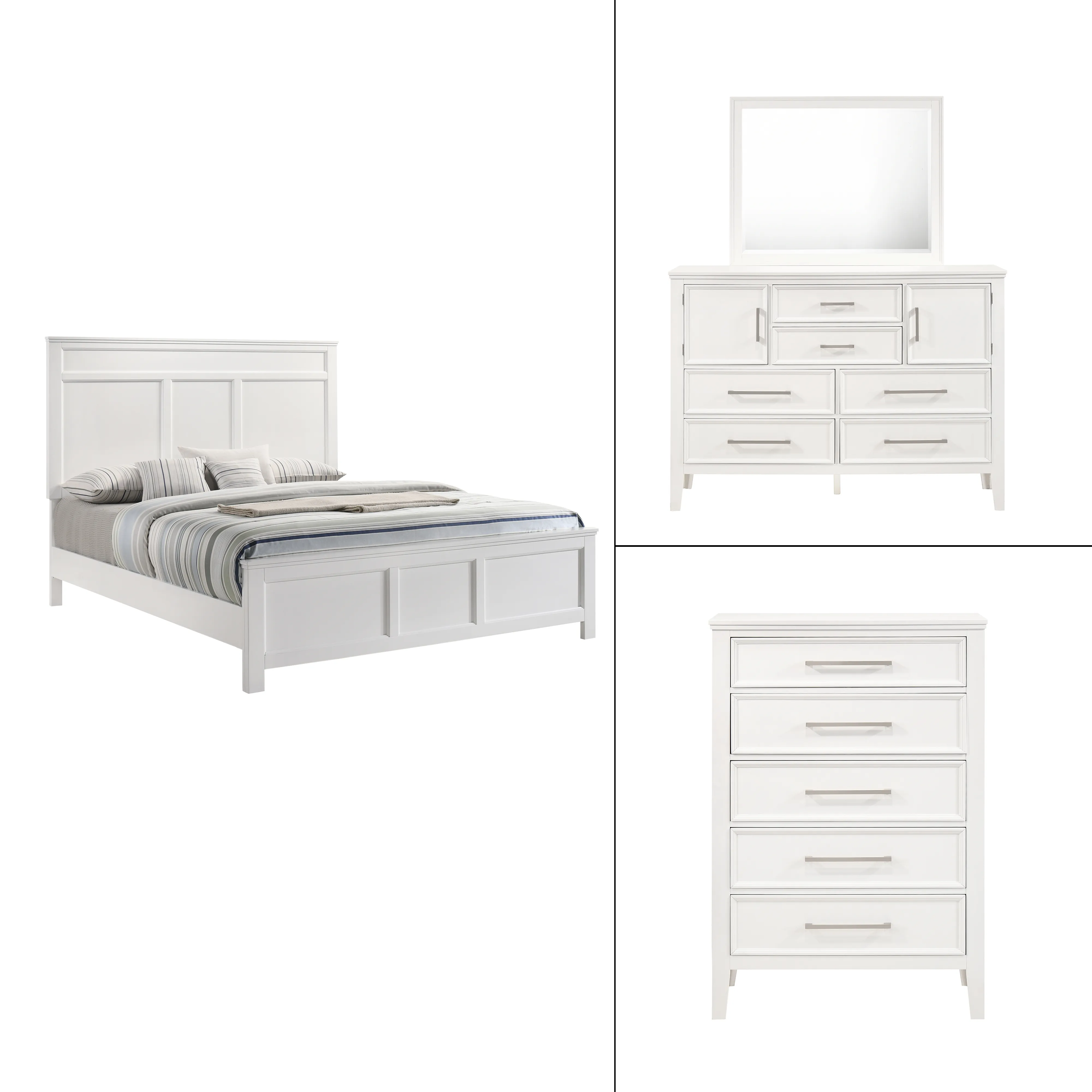 The Andover Wood 4-Piece Bedroom Set in White offers a perfect combination of durability, style, and functionality, making it an ideal choice for a complete bedroom upgrade. This set includes a Panel Bed, Dresser, Mirror, and Chest, all expertly crafted from solid Rubberwood, manufactured woods, and wood veneers, ensuring long-lasting durability while showcasing the natural beauty of real wood. The semi-gloss white finish delivers a crisp, versatile appeal that complements both modern and traditional decor styles, effortlessly enhancing your space with a fresh, refined look. The Andover collection''s clean lines and understated contemporary design create a seamless and cohesive aesthetic, with sleek, elongated metallic handles that add a sophisticated contrast to the pristine white finish. Framed drawer fronts provide visual depth and dimension, while sturdy block-style legs ensure a solid foundation that underscores the collection''s robust and enduring construction. The drawers glide smoothly on Kenlin drawer glides and feature dovetail joinery, reflecting superior craftsmanship and lasting quality. This set brings together timeless design and practical functionality, making it a stylish and enduring addition to your bedroom.