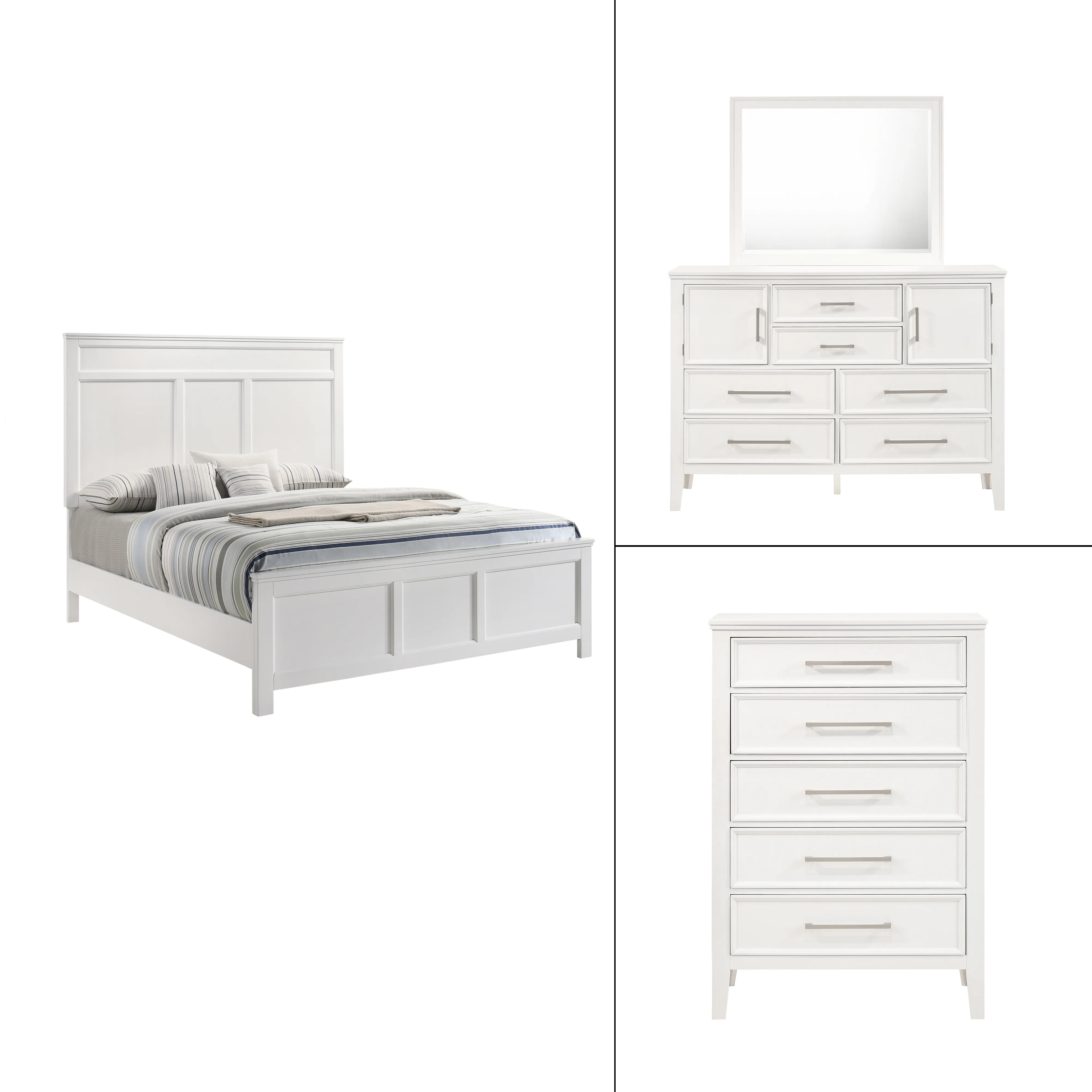 The Andover Wood 4-Piece Bedroom Set in White offers a perfect combination of durability, style, and functionality, making it an ideal choice for a complete bedroom upgrade. This set includes a Panel Bed, Dresser, Mirror, and Chest, all expertly crafted from solid Rubberwood, manufactured woods, and wood veneers, ensuring long-lasting durability while showcasing the natural beauty of real wood. The semi-gloss white finish delivers a crisp, versatile appeal that complements both modern and traditional decor styles, effortlessly enhancing your space with a fresh, refined look. The Andover collection''s clean lines and understated contemporary design create a seamless and cohesive aesthetic, with sleek, elongated metallic handles that add a sophisticated contrast to the pristine white finish. Framed drawer fronts provide visual depth and dimension, while sturdy block-style legs ensure a solid foundation that underscores the collection''s robust and enduring construction. The drawers glide smoothly on Kenlin drawer glides and feature dovetail joinery, reflecting superior craftsmanship and lasting quality. This set brings together timeless design and practical functionality, making it a stylish and enduring addition to your bedroom.