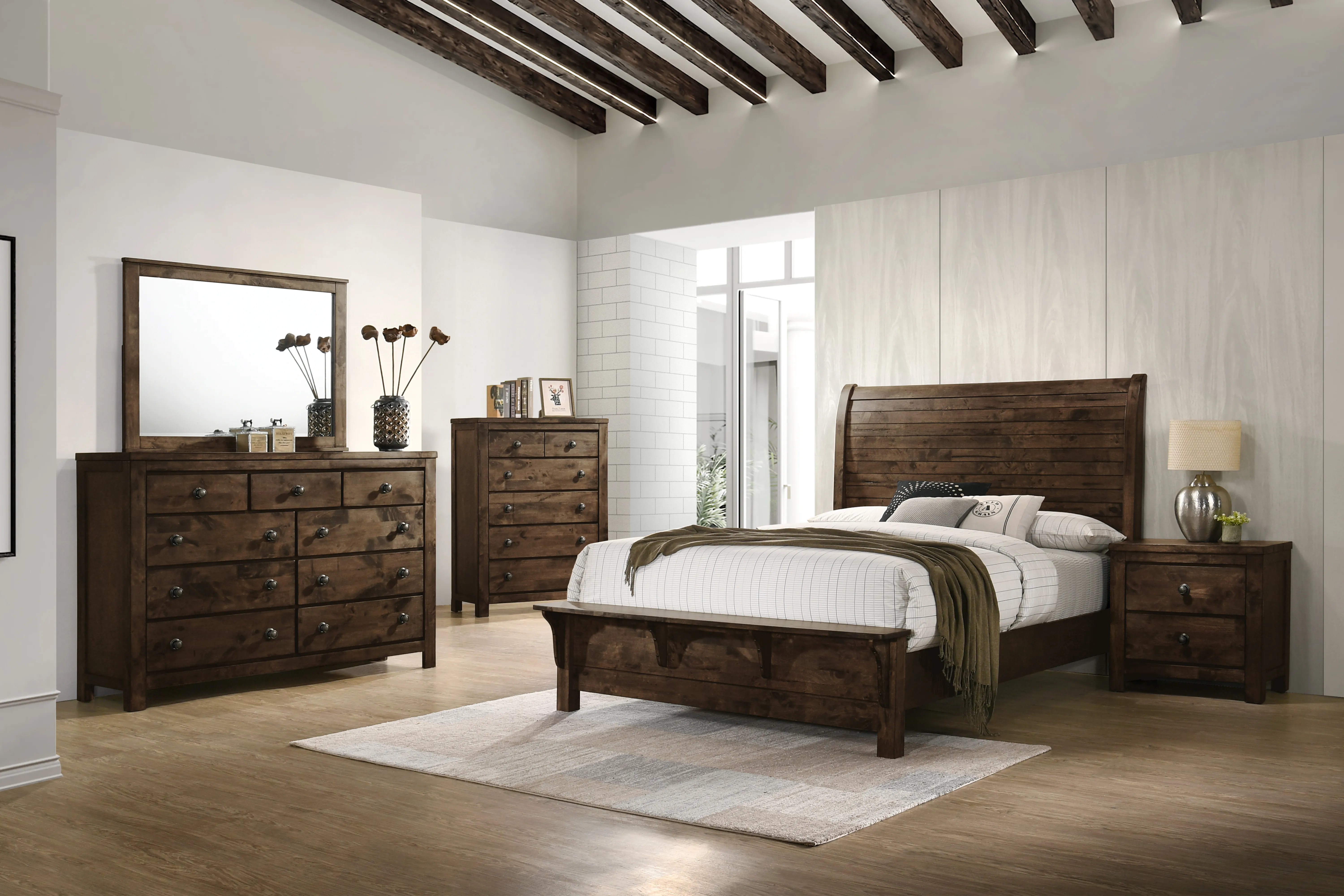 The 5 Piece Queen Blue Ridge Collection by New Classic Furniture offers a harmonious blend of sustainability and timeless design. Crafted from reclaimed solid wood, sourced from various origins, this set embraces eco-friendly construction, contributing to the responsible use of natural resources. The naturally timeworn appearance, characterized by nail holes, bug holes, water and mineral staining, checking, and open knots, tells a story of the wood''s history. Carefully selected boards highlight and preserve these unique traits, ensuring that no two pieces are alike. The solid wood strength of reclaimed wood, seasoned through years of service, is further reinforced with a finger joining technique, creating the hallmark long planks of the Blue Ridge. The multi-step finish, featuring a rustic brown with gray undertones and charcoal glazing, enhances the heavily distressed look. Effortless drawer operation, clean and carefree storage with felt-lined top drawers, and time-tested quality with four-corner English dovetail joinery define this set. Compliant with safety standards and backed by a 1-year limited warranty, the Blue Ridge Bedroom Set is a marvel of sustainable craftsmanship that prioritizes both style and safety. The set includes a Queen Bed, Dresser, Mirror, and 2 Nightstands to complete your perfect rustic haven.