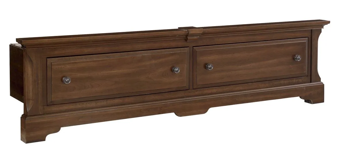 Heritage Sleigh Storage Bed. Raised panels with plank board detail and two drawer footboard storage. A relaxed traditional style constructed of Solid Cherry American-grown hardwood.