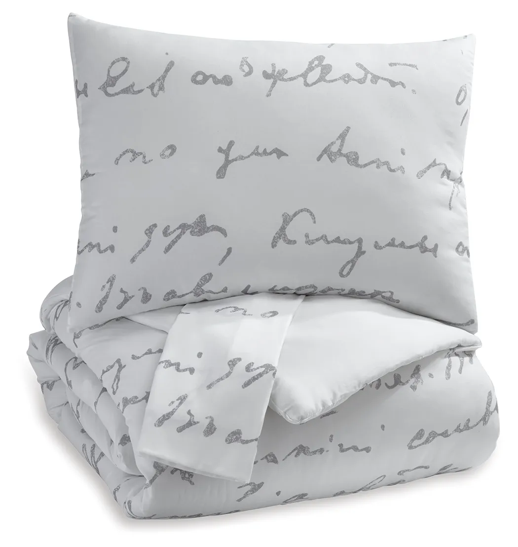 Express your love for words with the unique script design of this comforter. Featuring white and gray undertones, this neutral and contemporary bedding will add a special touch to any room.