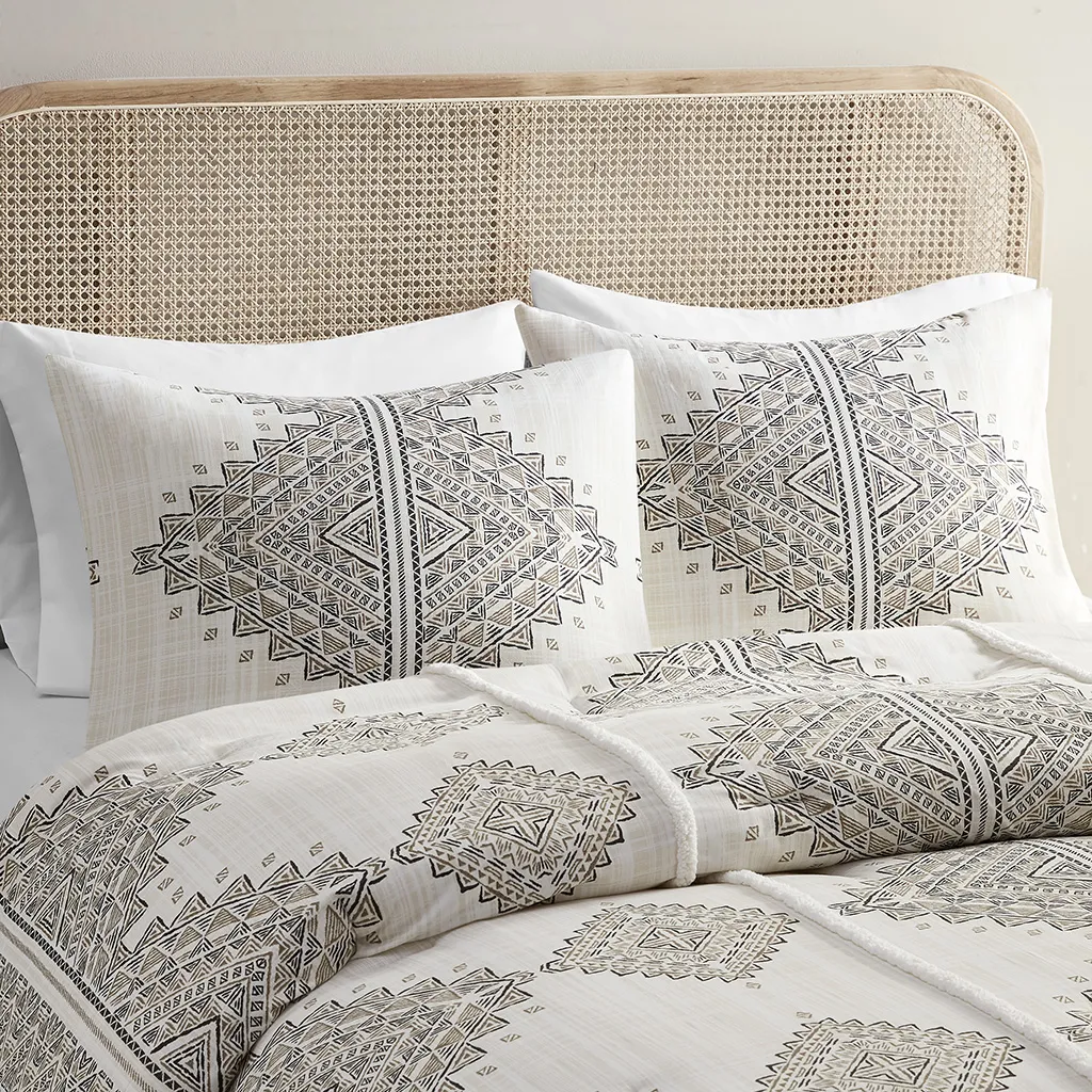 This soft microfiber artisan comforter set displays a printed global inspired design, perfect for chic boho bedroom. Featuring small triangular shapes and lines that when formed together depicts larger geometric shapes and stripes on top of a beige and ivory background. Two white chenille trim at the center of the bed adds dimension to the set while the dark throw pillow adds contrasts. Colors featured in this set include various shade black, brown, tan, and grey. The comforter and pillows are filled with hypoallergenic polyester filling that is treated to be dustproof, ensuring a restful and comfortable sleeping experience. This bedding set is also OEKO-TEX certified and machine washable for easy care.