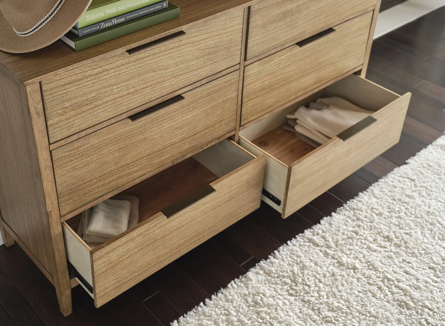 Cedar Lined Bottom Drawers: Known for its pleasant aroma, cedar absorbs unwanted odors and wards off moths, making it a perfect material to store seasonal linens and clothing!