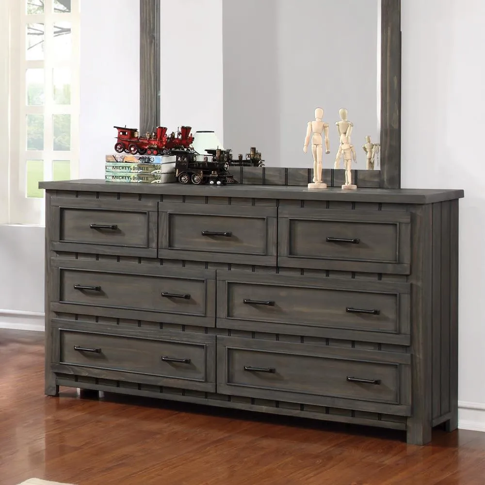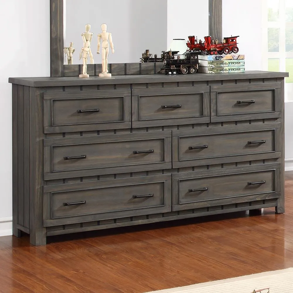 With seven spacious drawers, this dresser is fashionable and functional. Its simple, wooden frame is accentuated by eye-catching, carved embellishments. Its subdued, gunsmoke finish gives it a casual and stylish look. Sleek, metal hardware rounds out its classic design. Ideal for a child's bedroom, this dresser offers maximum durability.