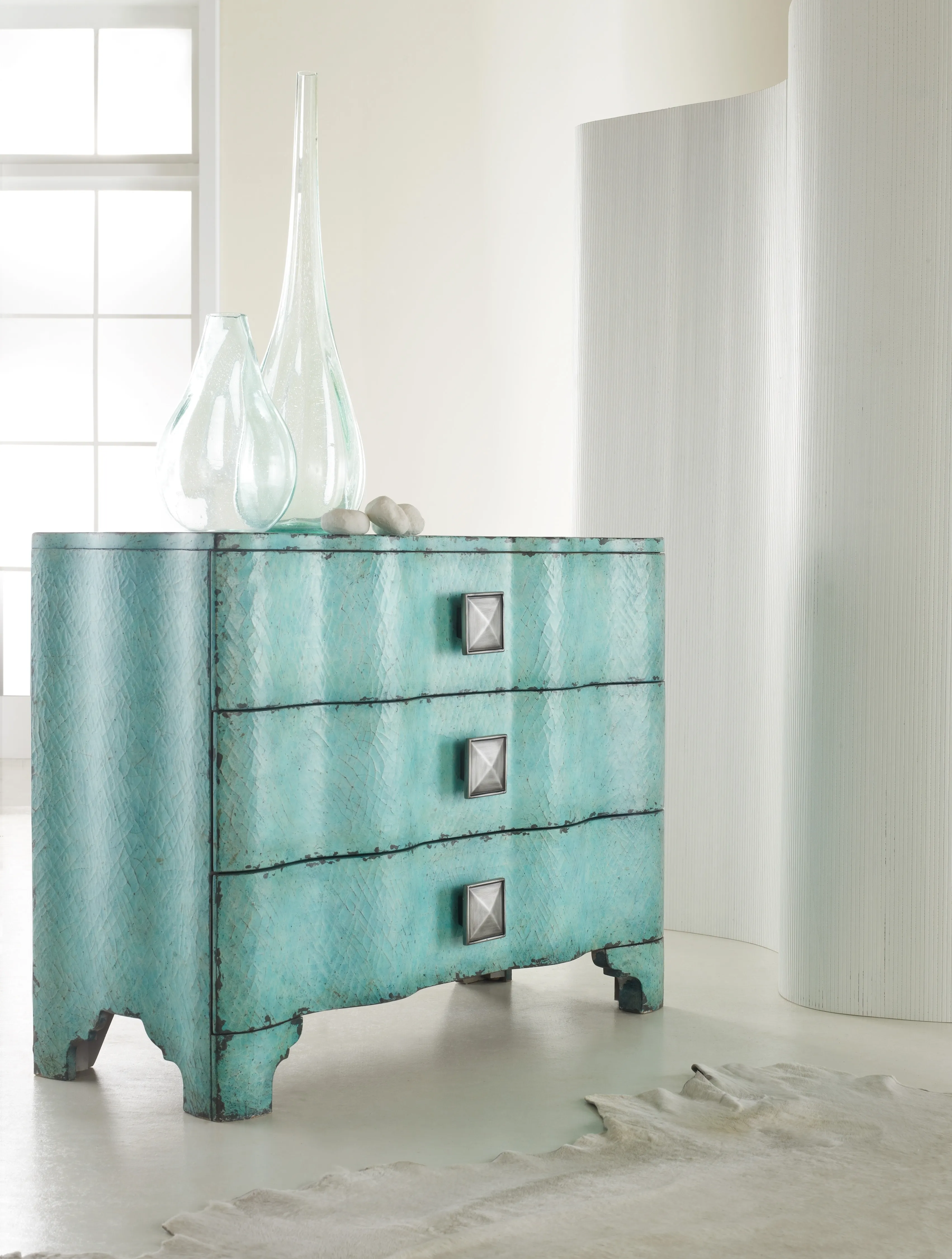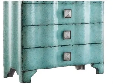 Create a buzz at your house with this curvy, glamorous Turquoise Crackle Chest.