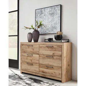 Inspired by natural beauty, refined to perfection. This dresser brings cozy outdoor vibes to your bedroom with its warm and inviting golden rustic finish. Handles in an antiqued gunmetal hue adorn the six drawers on its framed front, adding an industrial touch to the simple, streamlined design.