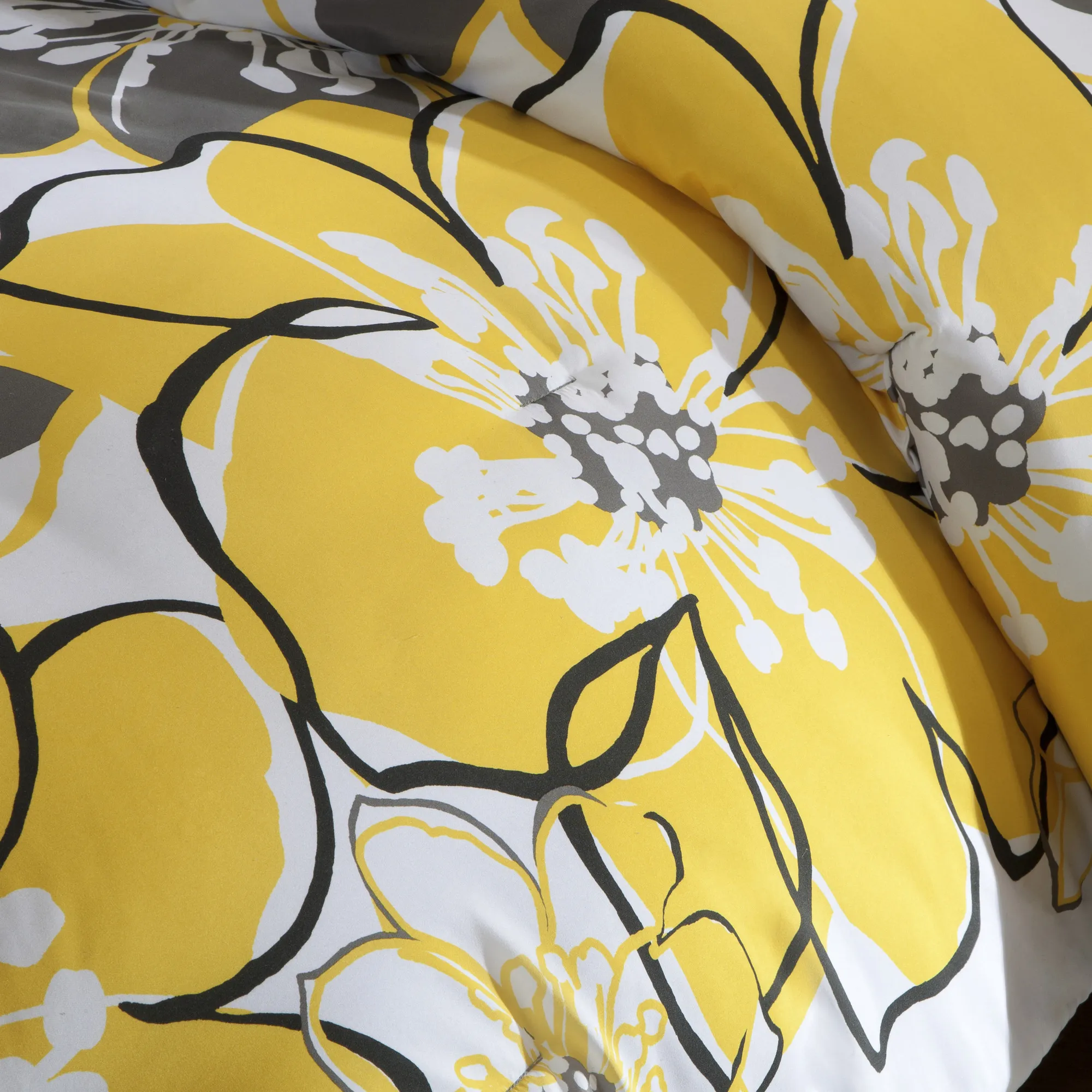 For a fresh look, the Allison Comforter Set can brighten up your room with its vibrant yellow and grey shades. The comforter and shams (1 for Twin/Twin XL) feature a printed, overscaled floral motif that is set to one side on a bright white backdrop. This beautiful design reverses to a solid grey color. The dark grey and black accent colors help to outline the oversized floral pattern and are used in the matching decorative pillow to correspond back to the bright yellows in this set. Made from polyester microfiber the comforter and shams (1 for Twin/Twin XL) are soft to the touch and machine washable for easy care. This floral comforter set has antimicrobial treatment that provides built-in freshness protection, reducing the growth of odor causing bacteria to keep fabric lasting longer.