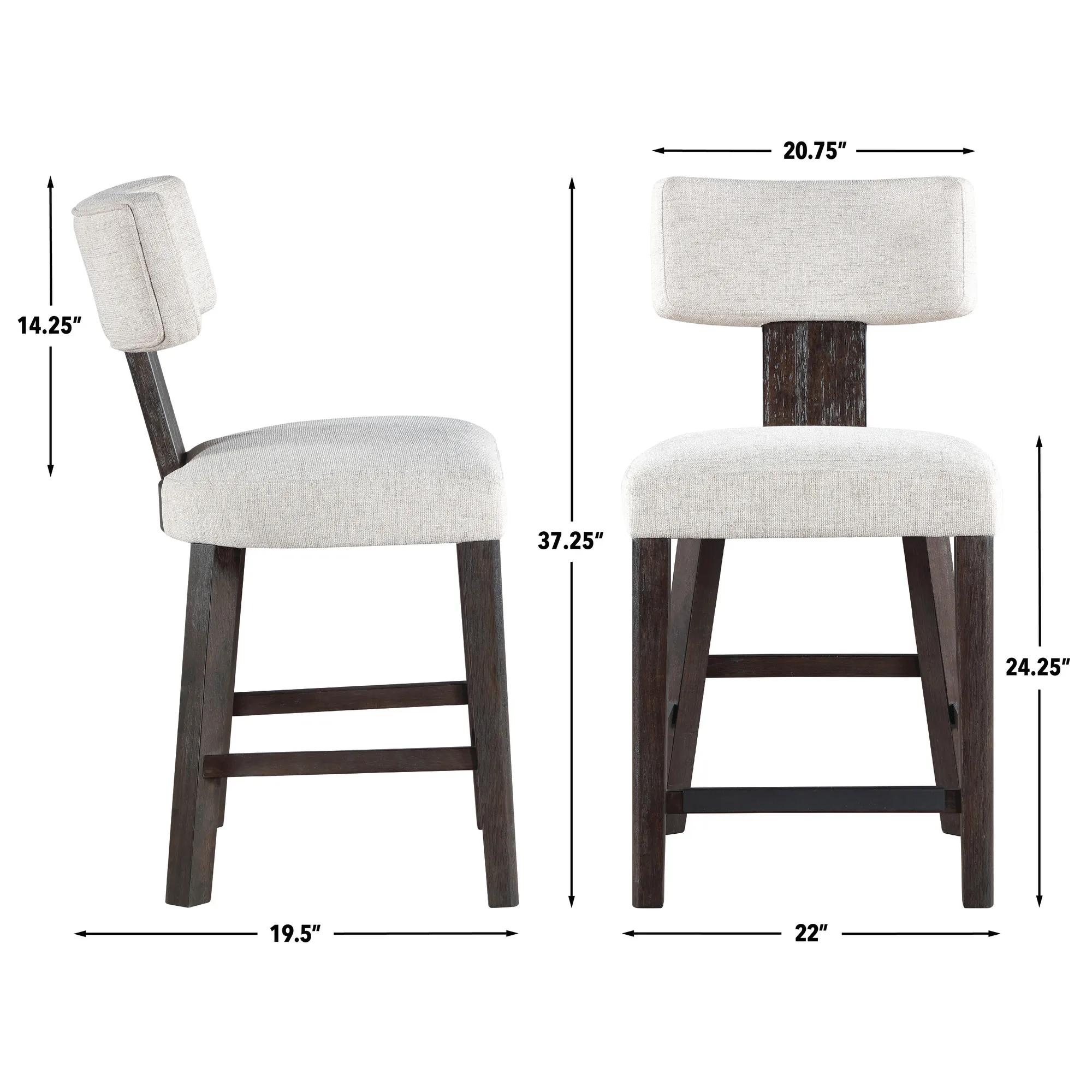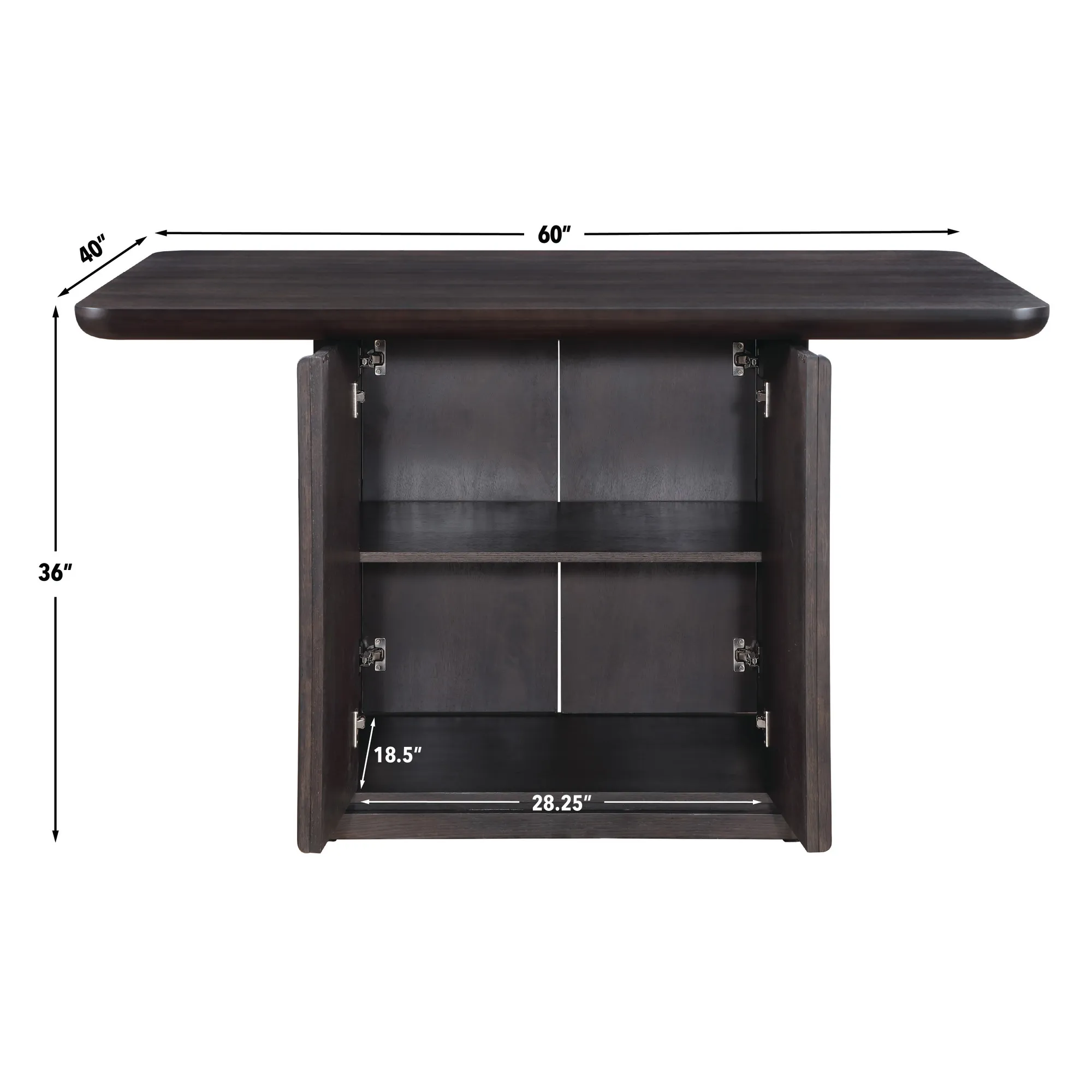 Bring style and comfort to your kitchen or dining space with the Oakley 5-Piece Counter Set. The 60" counter-height table features hidden storage with dual doors and a shelf—perfect for keeping dining essentials close. Finished in a rich charcoal brown, the table’s rounded corners and cove bullnose edge add a modern touch. Four counter stools offer plush comfort with upholstered barrel-style backs and cushioned seats in light gray herringbone fabric. Designed for everyday living, Oakley blends casual elegance with lasting durability.