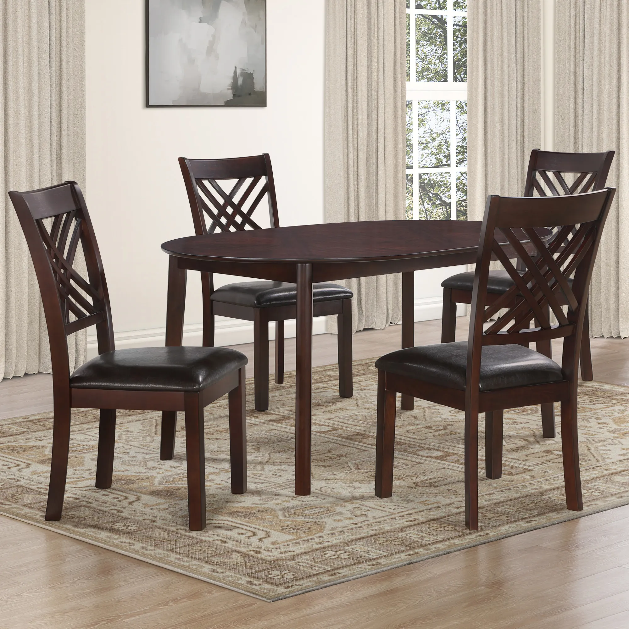 The 5-piece Adrian Dining Set delivers bold contemporary style and everyday comfort in a smart, space-friendly design. Centered around a 60" oval pedestal table in a rich espresso finish, the set includes four “X”-back side chairs with upholstered seats for a sleek yet cozy dining experience. The modern silhouette and deep finish elevate smaller dining areas with a touch of sophistication. Perfect for casual meals or stylish entertaining, the Adrian set combines form and function to create a polished, inviting atmosphere for up to six guests.