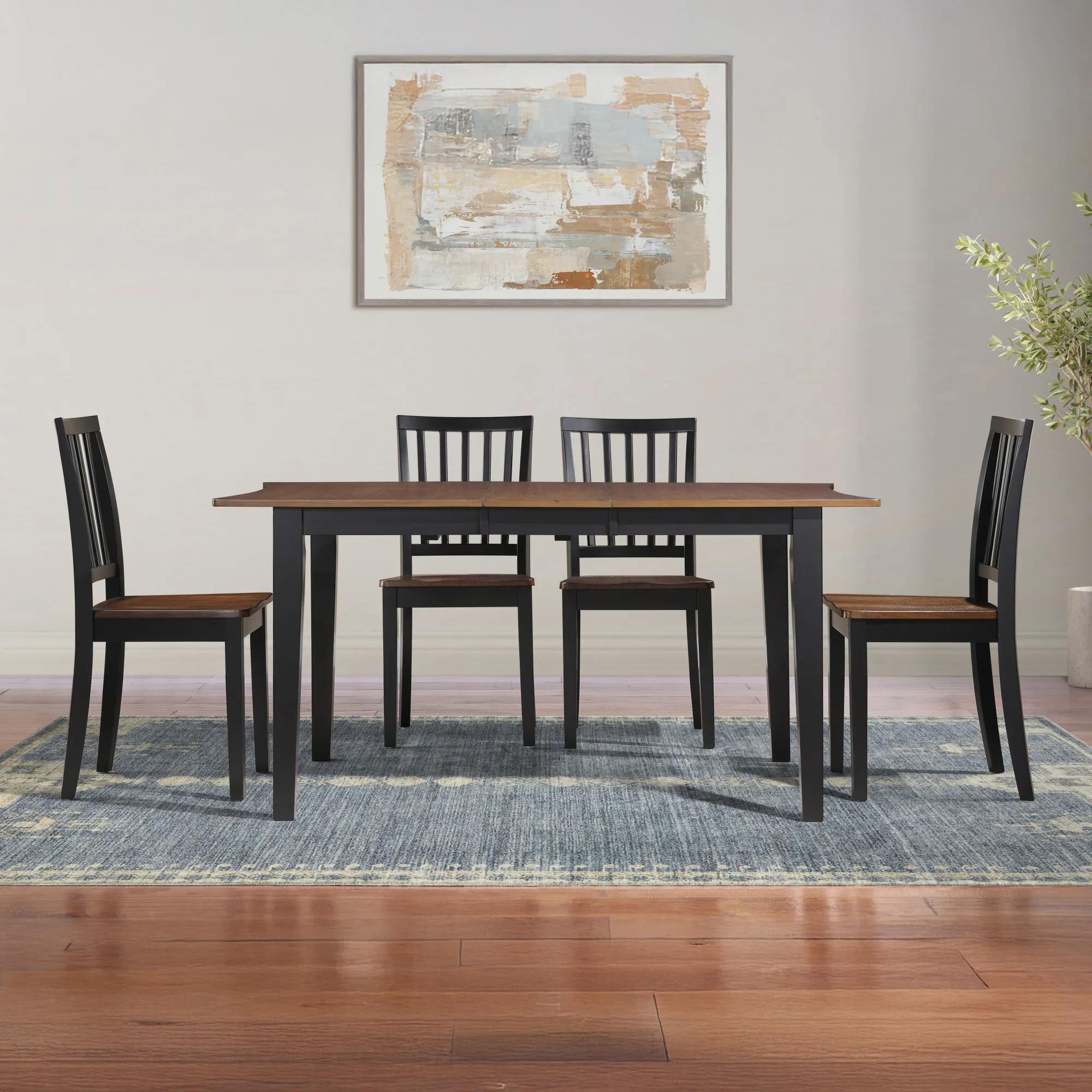 The Joplin 5-Piece Dining Set combines timeless farmhouse charm with modern versatility. The 50-62" dining table features a rich walnut veneer top, ebony-finished solid wood legs, and concave edges for added style. A 12" leaf expands the table to seat six comfortably. Paired with four schoolhouse-inspired side chairs, finished in coordinating walnut and ebony tones, each scooped seat offers comfort while solid wood construction ensures lasting durability. Perfect for dining rooms or cozy spaces, Joplin delivers warmth, strength, and classic appeal.