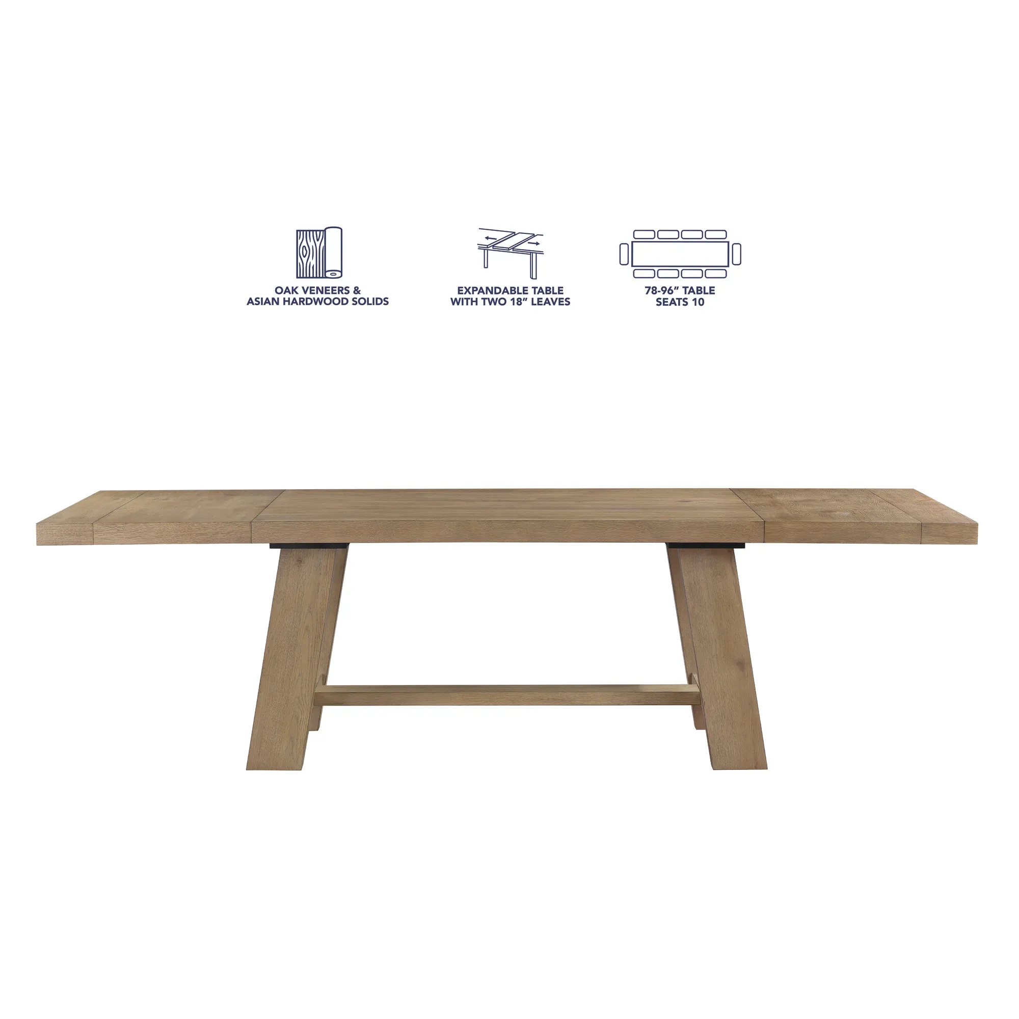 - The 72-inch table expands to 108 inches with the two included 18-inch leaves, to seat up to 10 people.