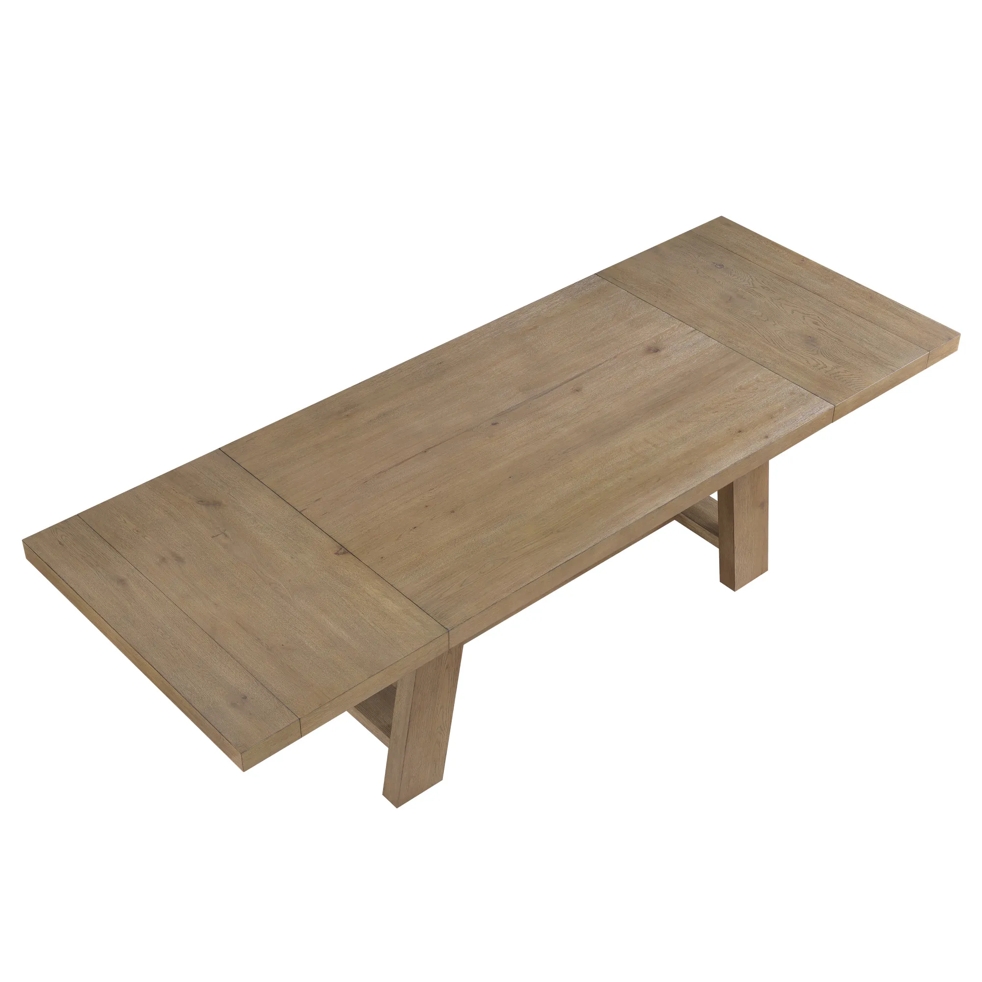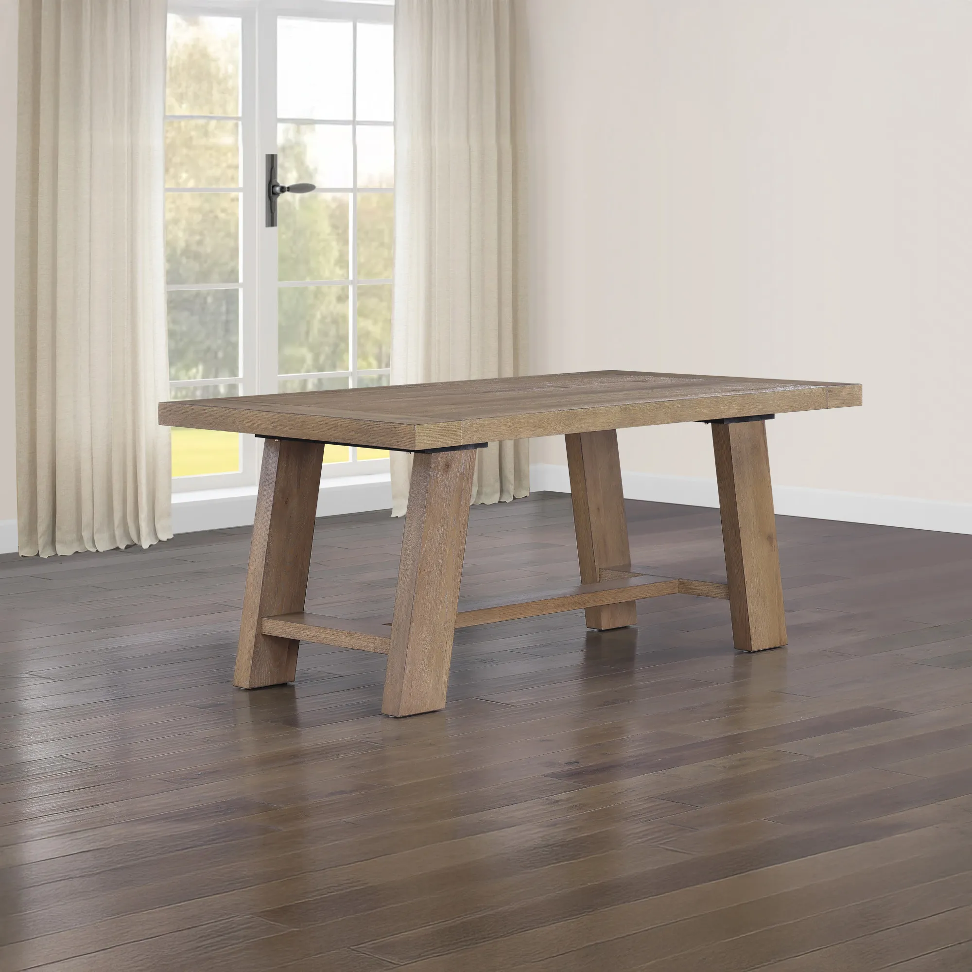 The Orinda 72-108 inch dining table combines casual rustic modern styling with a mid-century flair. Featuring a canted double-pedestal base, it blends primitive design elements with mid-century touches for a striking centerpiece in any dining room. Crafted with oak veneers in a warm caramel finish, this table includes two 18-inch leaves, allowing it to extend from 72 inches to 108 inches, comfortably seating up to 10 guests in rustic sophistication.