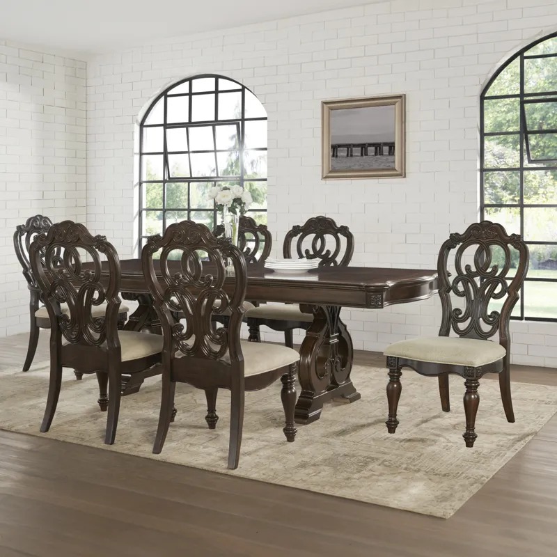 - Set includes Royale Dining Table and six Side Chairs. Each item also sold separately.