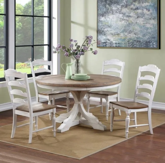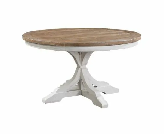 Augusta 54" Round Table - Rustic Brown/White (DA25454P): 54 x 54 x 30 - Rustic pine veneer, engineered wood, and solid hardwood, Heavy distressing and wire brushed texture, Top thickness: 1.5", Apron: 2.25", Floor to apron: 26.25"