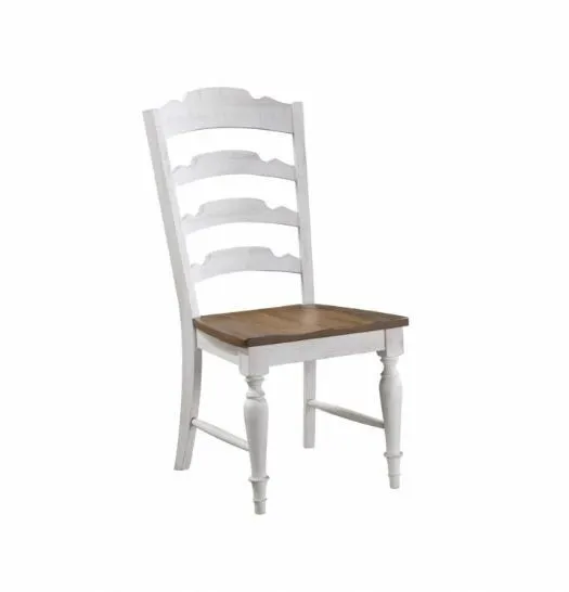 Augusta Ladder Back Side Chair - Rustic Brown/White x4 (DA2451SP): 19 x 24.5 x 40 - Solid hardwood, Heavy distressing and wire brushed texture, Plastic glides on legs, Seat width: 19", Seat depth: 17", Front legs: 2.25"W x 2.25"D x 17"H, Backrest: 18.5"W x 2"D x 20"H