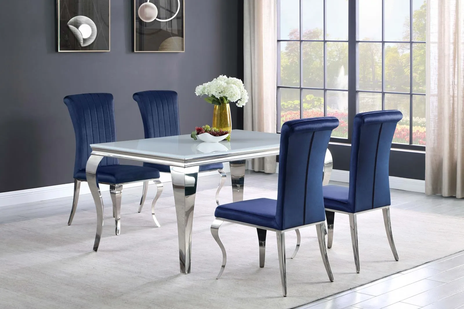 Elegant with a touch of glamorous, this dining table adds a wonderful statement piece to a more formal dining room. Made with mixed materials of durable stainless steel and glass, this dining table features lends itself to a variety of color palettes. A polished and gleaming chrome finish on the table base, complete with classic Cabriole legs, lend a traditional flair to a contemporary style. Gather around and get your plates on the opaque white tempered glass tabletop. In addition, this dining table seats six people comfortably.