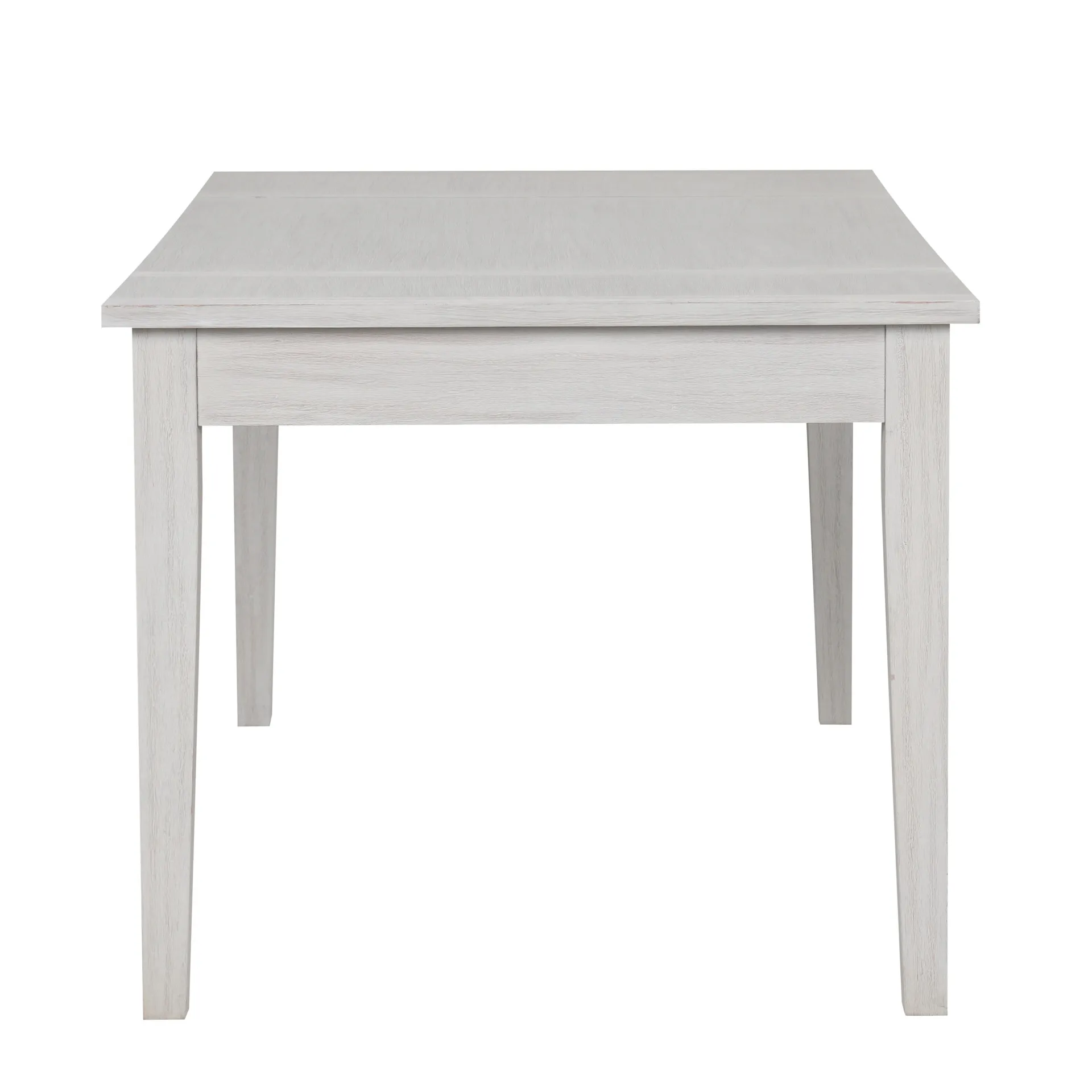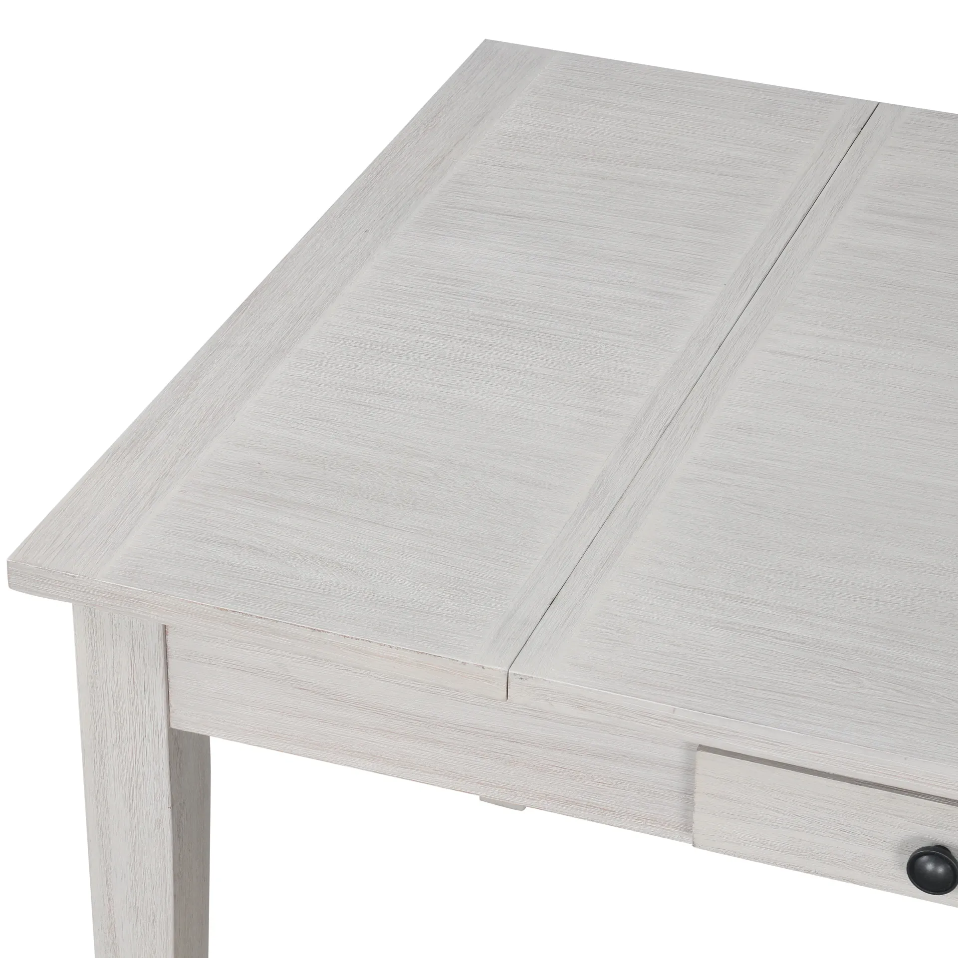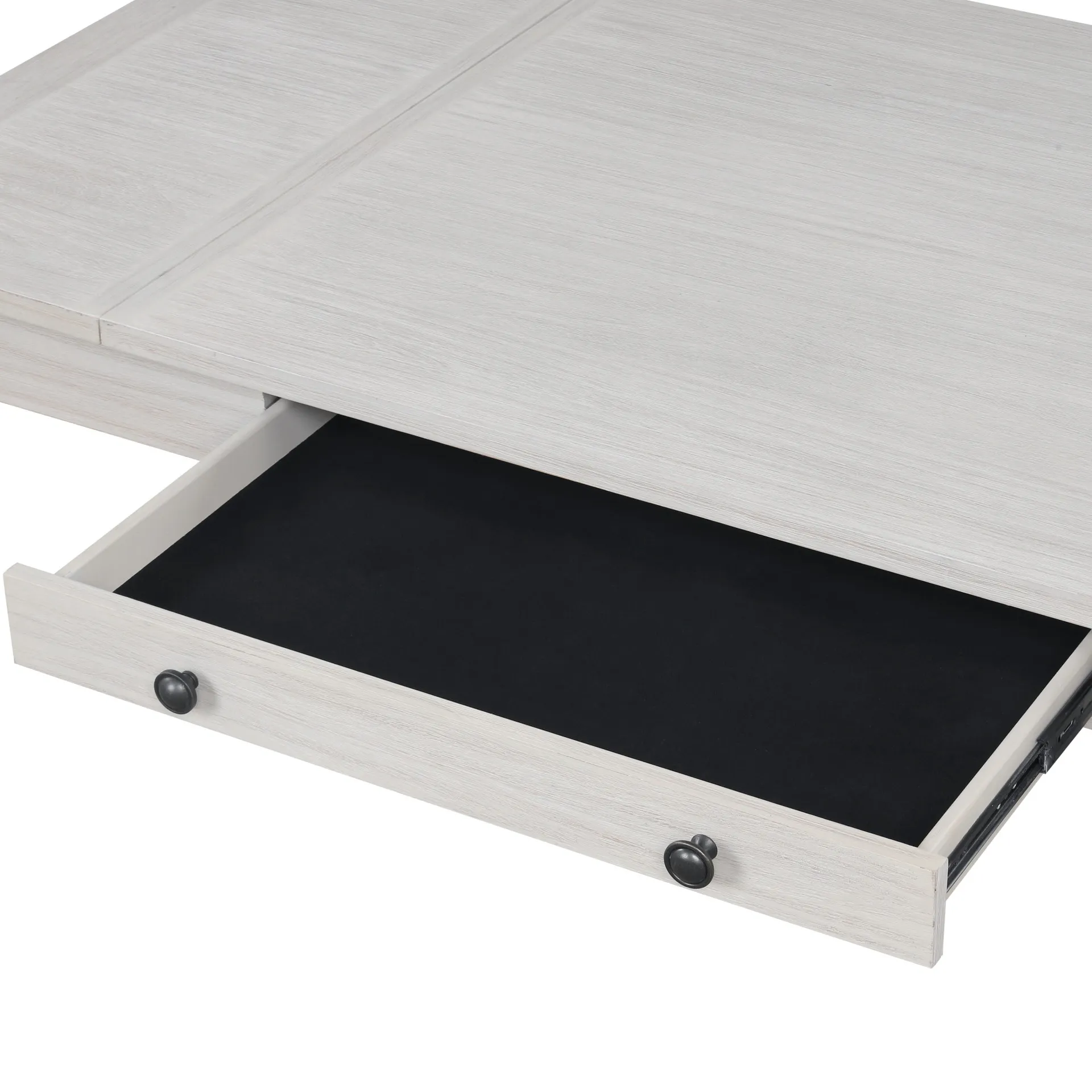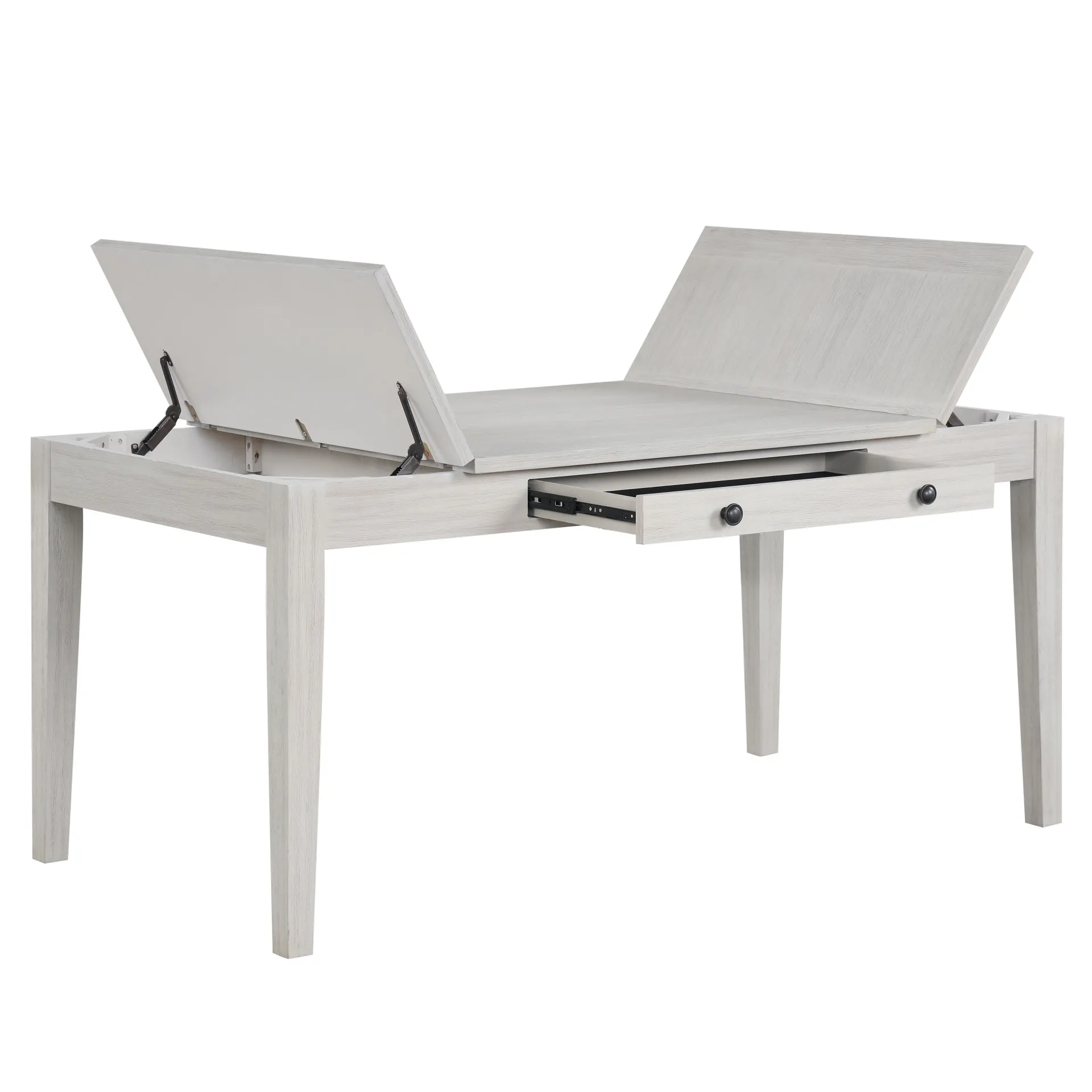 The Echo Rectangle Dining Table blends style, durability, and function. Crafted from solid Rubberwood and engineered woods, it offers strength and the charm of Oak veneers. A driftwood finish enhances the wood grain with pale gray and white wash tones for a warm look. Built-in storage includes a central drawer for flatware and lift-top compartments at both ends for linens or games. At 66" long, it seats six comfortably, making it perfect for intimate dinners or lively gatherings
