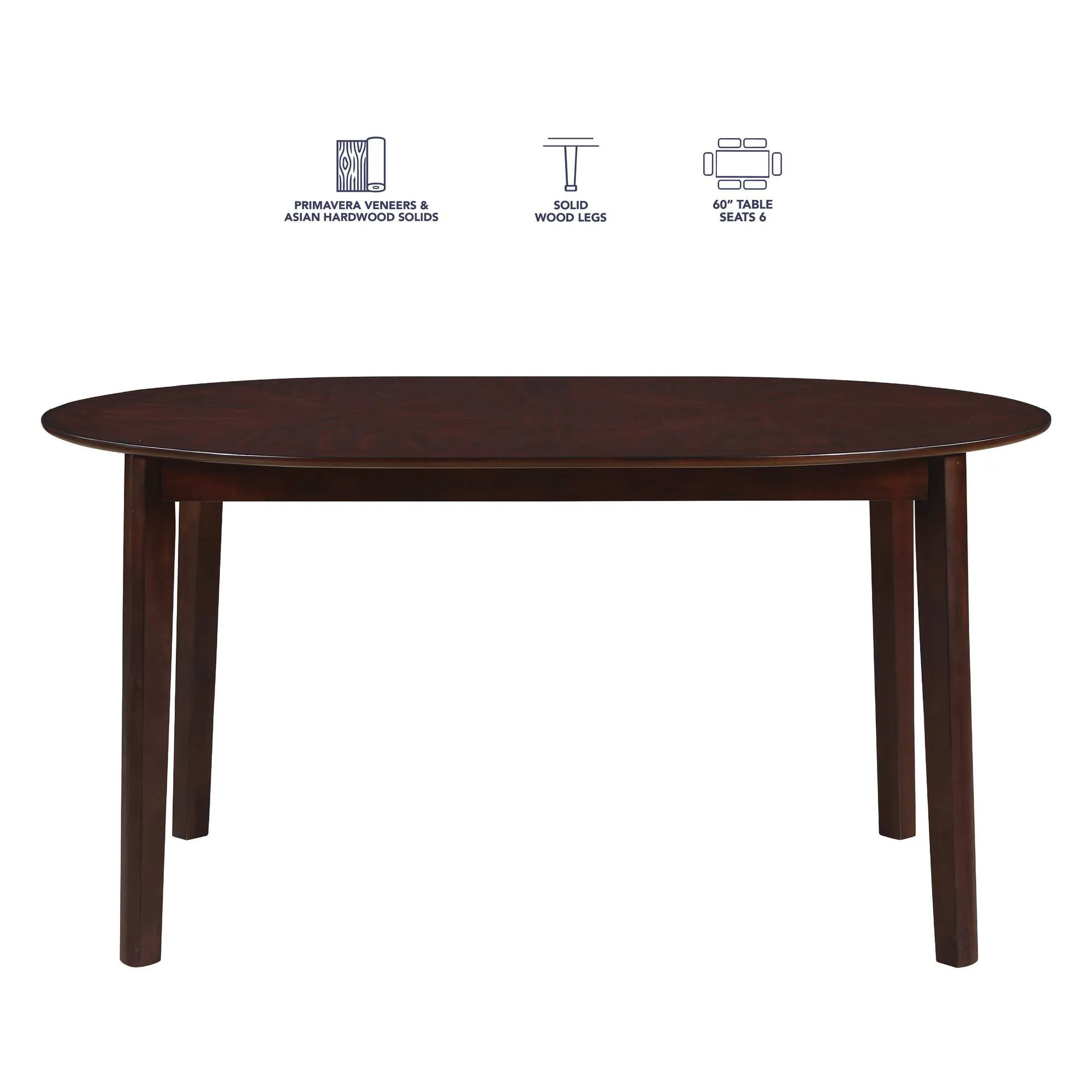 - The 60-inch oval table seats up to six guests