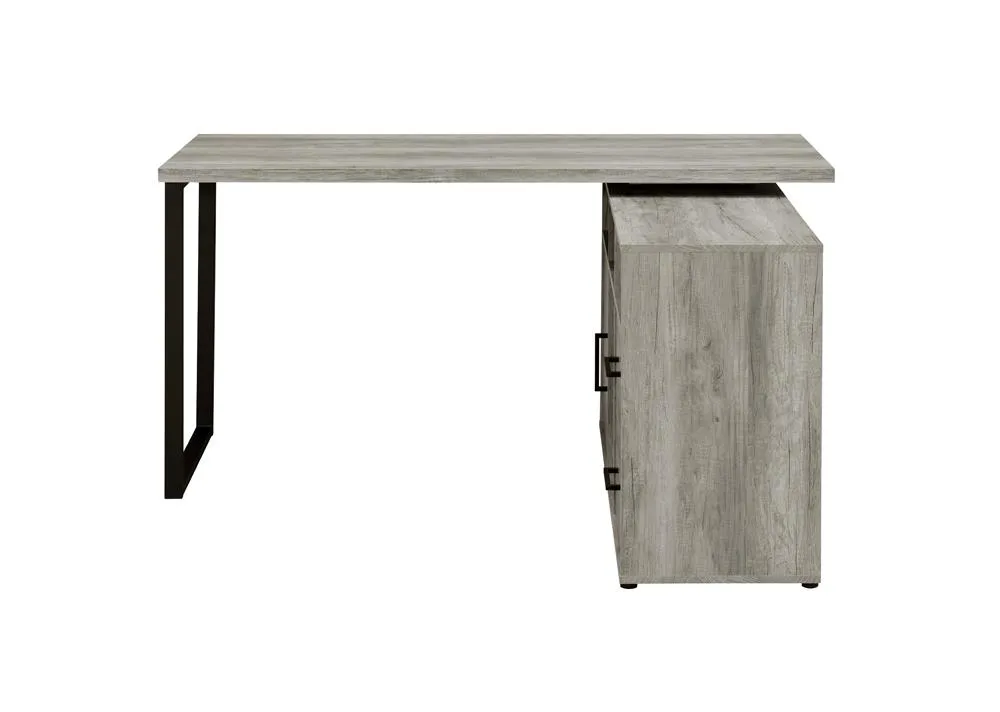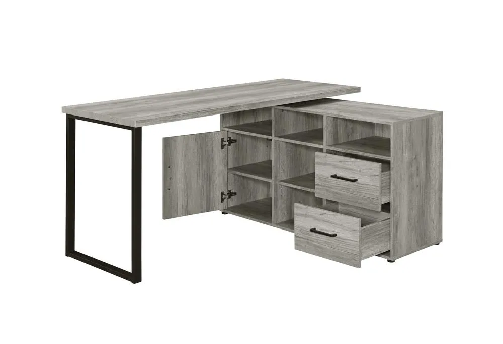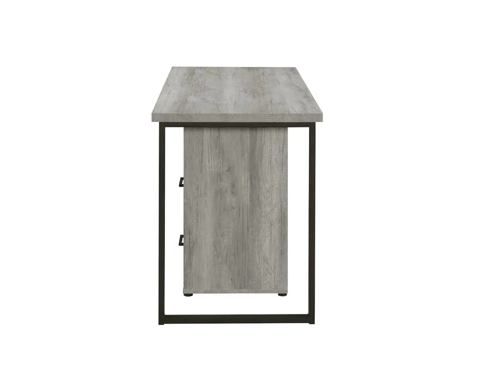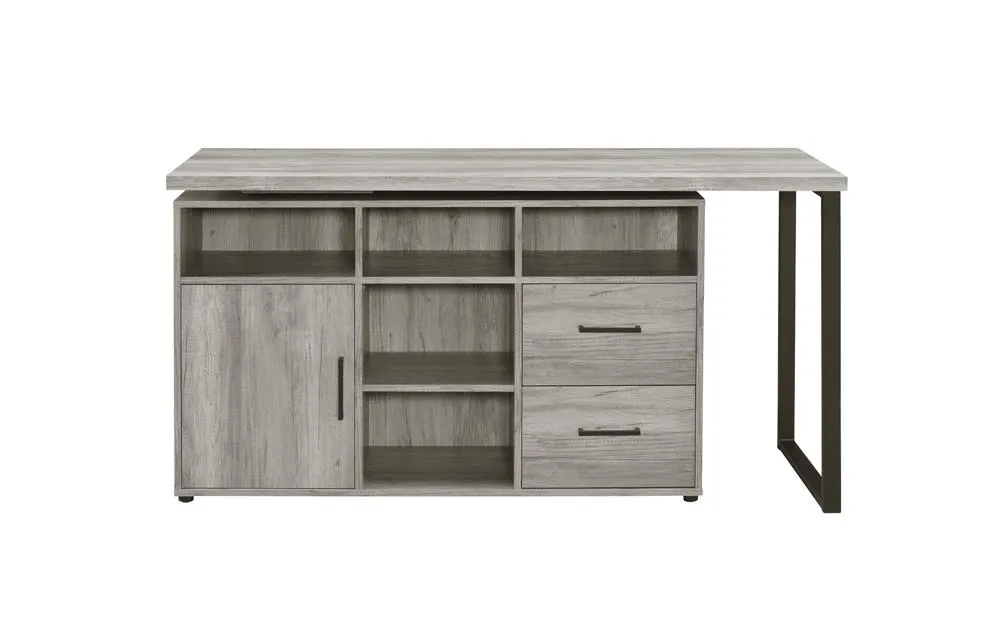You're bound to win the prize for the most organized workspace with this office desk. Its rustic design is enhanced with a sleek geometric style frame. The open design provides a clean and airy appearance. Five open shelves are perfect for displaying decor. Stylishly organize your belongings within the two built-in drawers with sleek bar pulls.