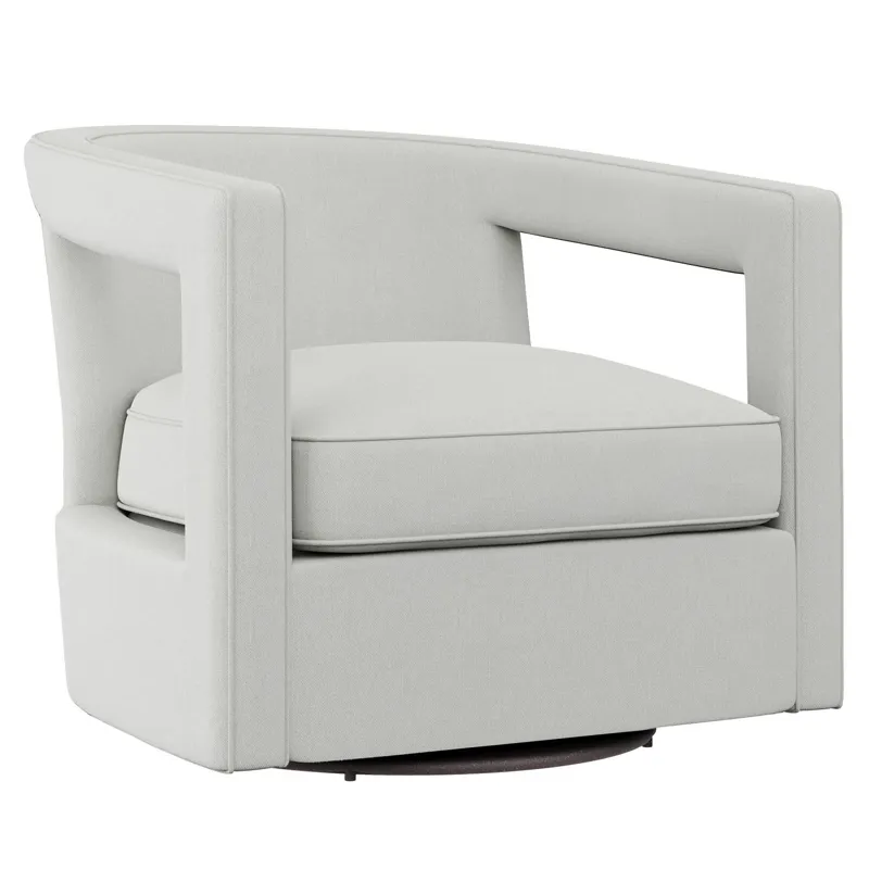 The sleek, sculptural design of the Alana swivel chair adds modern flair to an interior, blending seamlessly with contemporary and transitional styles. Two cutouts on either side offer a crisp, polished look. Webbing construction and spring down cushioning provide luxurious comfort and support.