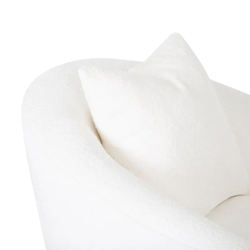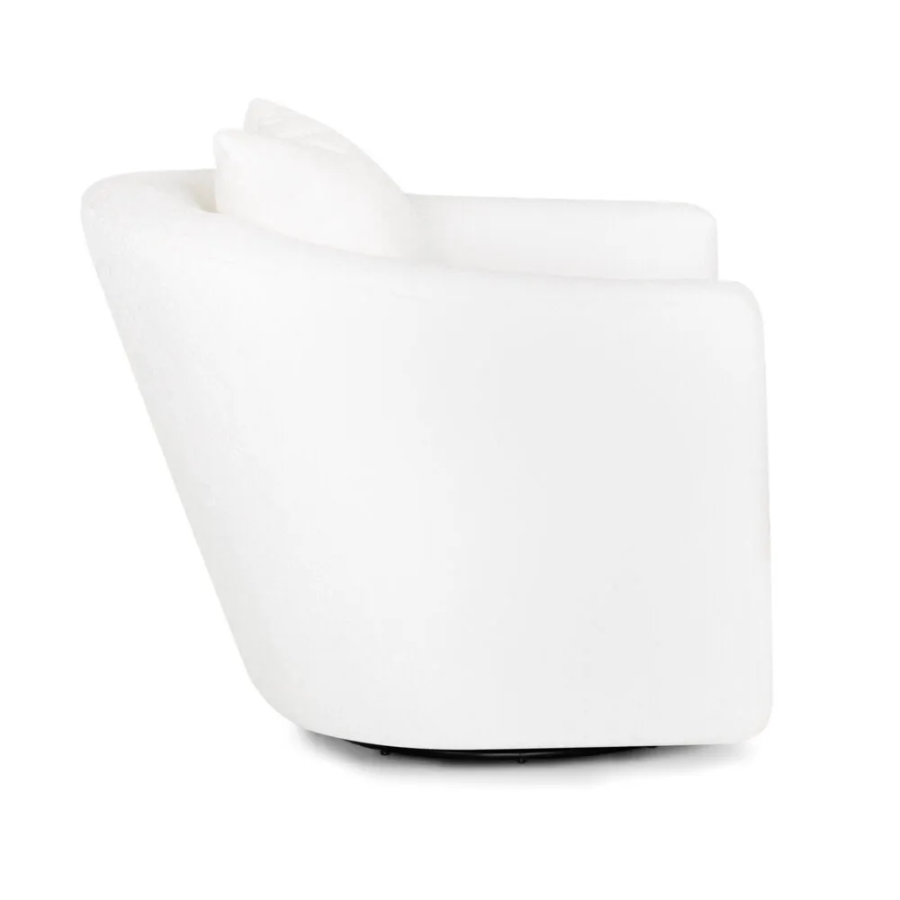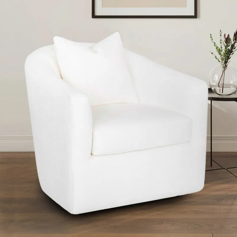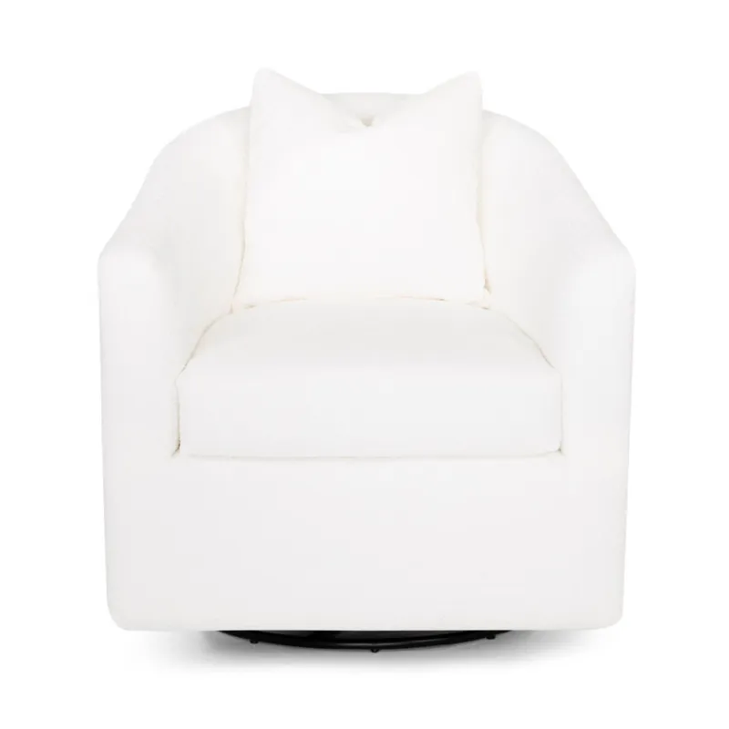 The 21980 Maya swivel chair is the perfect addition to any room in your home. The soft boucle-like fabric and Everplush™ fiber brings the comfort of sitting on a cloud. The Maya has a sturdy metal base that effortlessly glides quietly and smoothly, plus it swivels 360°! It is compact and space-saving without compromising on comfort. The Maya has a mod silhouette and will be your new favorite place to to sip a cup of coffee, dive into a fabulous book, or just relax comfortably.