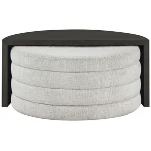 - The ottoman, upholstered in 100% polyester cross-hatch boucle fabric in an eggshell hue, offers a durable, easy-to-clean surface that resists everyday stains and spills.